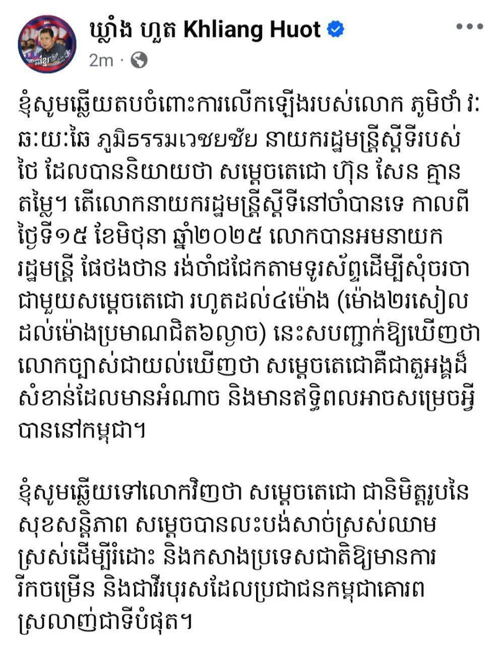 Earlier, Khliang Huot responded to the Acting Prime Minister and former Minister of Defence of Thailand, who had attacked me.