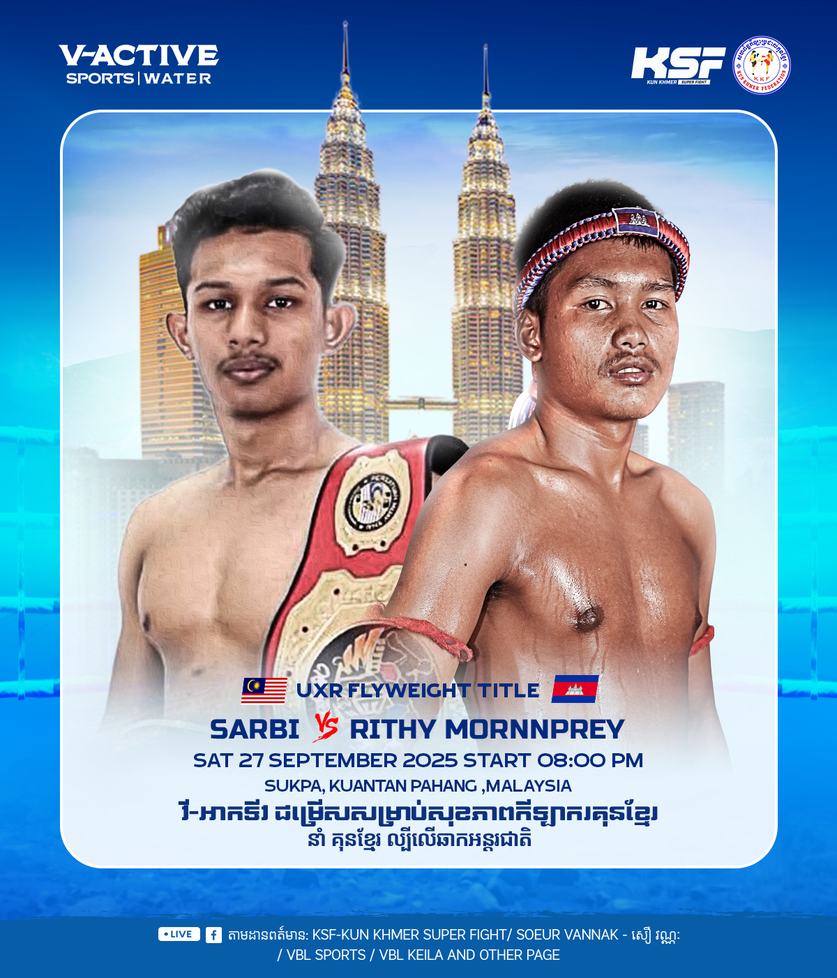 ជួបគ្នាថ្ងៃទី២៧ ខែកញ្ញា ឆ្នាំ២០២៥ វេលាម៉ោង ៨យប់តទៅ ទីតាំងប្រកួត ខេត្ត SUKPA សង្កាត់ KUANTAN PAHANG ប្រទេសម៉ាឡេស៊ី និងផ្សាយផ្ទាល់តាមរយ:ផេកផ្លូវការ KSF-KUB KHMER SUPER FIGHT/SOEUR VANNAK និងផេកផ្លូវការ VBL-SPORTS and VBL-KEILA។