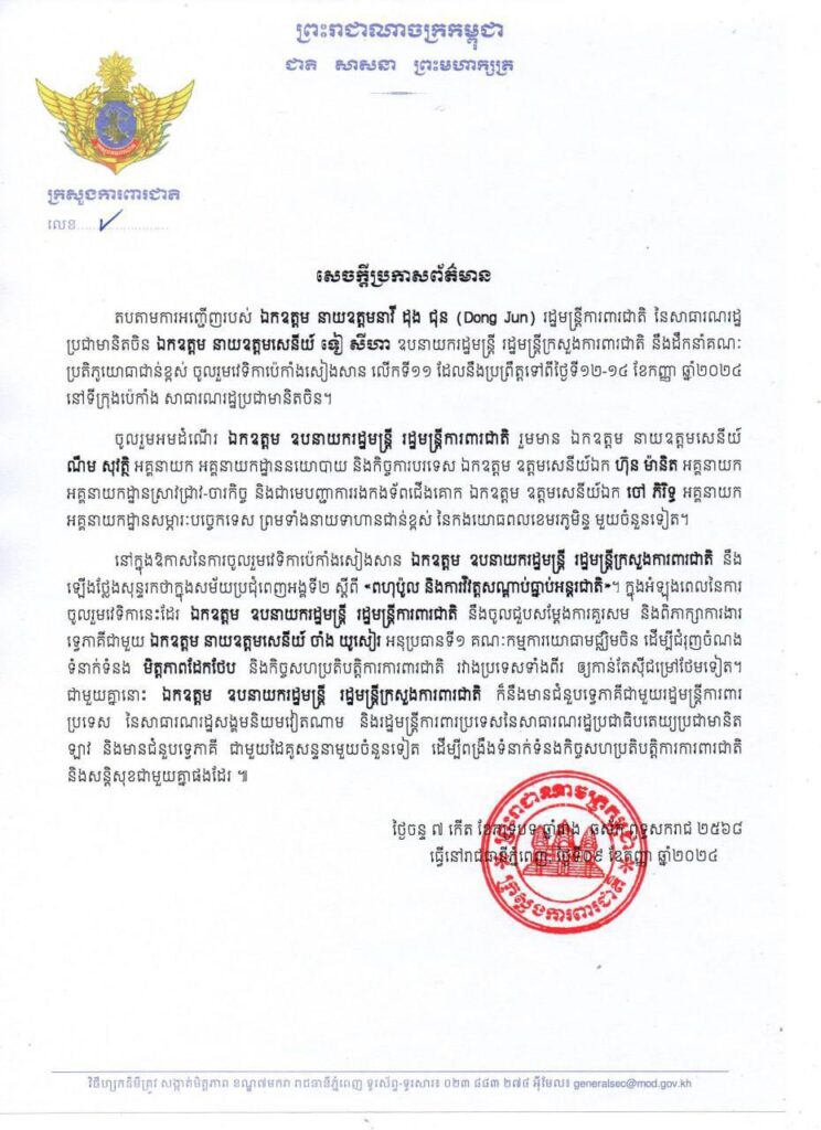 នាព្រឹកថ្ងៃទី១០ ខែកញ្ញា ឆ្នាំ២០២៤ តបតាមការអញ្ជើញរបស់ ឯកឧត្តម នាយឧត្តមនាវី ដុង ជុន ( Dong Jun ) រដ្ឋមន្ត្រីការពារជាតិ នៃសាធារណរដ្ឋប្រជាមានិតចិន ឯកឧត្តម នាយឧត្តមសេនីយ៍ ទៀ សីហា ឧបនាយករដ្ឋមន្រ្តី រដ្ឋមន្ត្រីក្រសួងការពារជាតិ នឹងដឹកនាំគណៈប្រតិភូយោធាជាន់ខ្ពស់ ចូលរួមវេទិកាប៉េកាំងសៀងសាន លើកទី១១ ដែលនឹងប្រព្រឹត្តទៅពីថ្ងៃទី១២-១៤ ខែកញ្ញា ឆ្នាំ២០២៤ នៅទីក្រុងប៉េកាំង សាធារណរដ្ឋប្រជាមានិតចិន៕