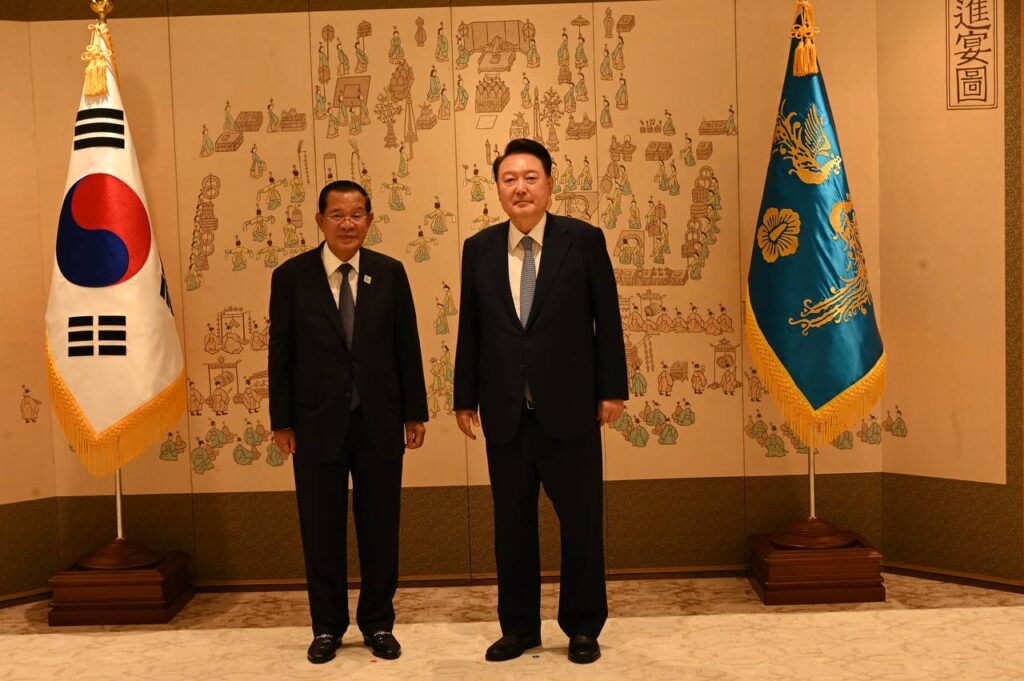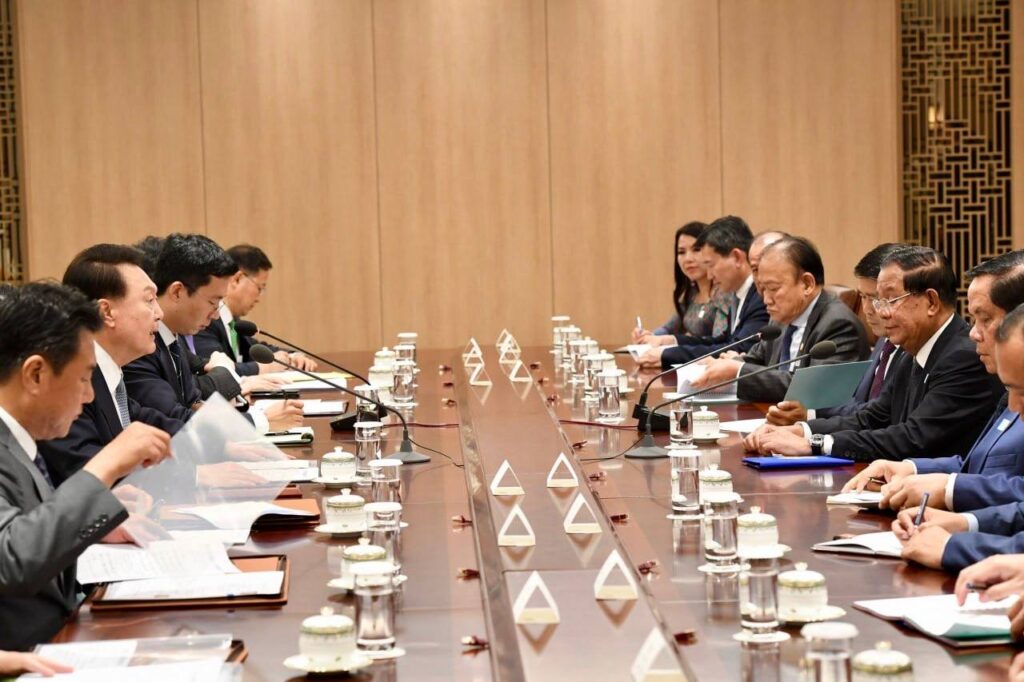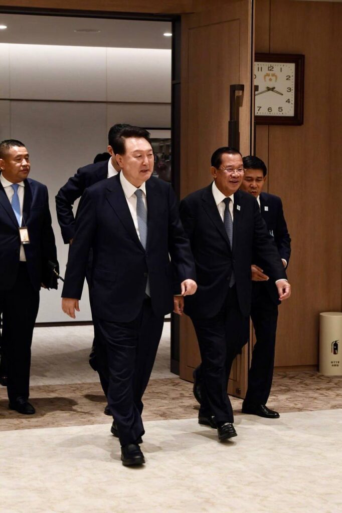 សេអ៊ូល៖ នារសៀលថ្ងៃទី១១ ខែកញ្ញា ឆ្នាំ២០២៤ សម្តេចអគ្គមហាសេនាបតីតេជោ ហ៊ុន សែន ប្រធានព្រឹទ្ធសភា នៃព្រះរាជាណាចក្រកម្ពុជា អញ្ជើញជួបសម្តែងការគួរសម និងពិភាក្សាការងារ ក្នុងកិច្ចសហប្រតិបត្តិការរវាងប្រទេសទាំងពីរ ជាមួយឯកឧត្តម យូន ស៊ូកយ៉ល (Yoon Suk-Yeol) ប្រធានាធិបតី សាធារណរដ្ឋកូរ៉េ នៅវិមានប្រធានាធិបតី ក្នុងទីក្រុងសេអ៊ូល ។