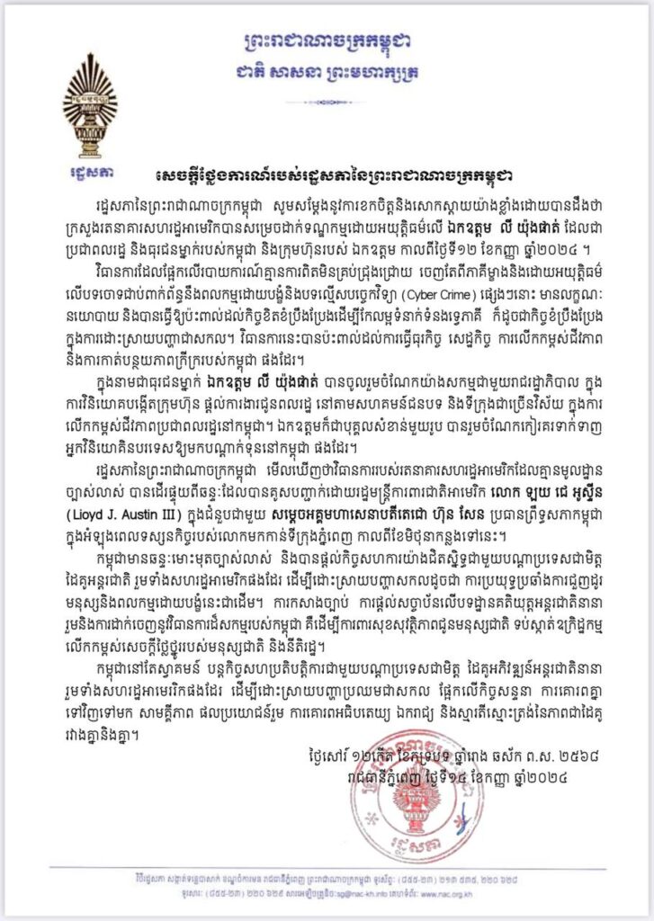 នារសៀលថ្ងៃទី១៤ ខែកញ្ញា ឆ្នាំ២០២៤ រដ្ឋសភានៃព្រះរាជាណាចក្រកម្ពុជា ចេញសេចក្តីថ្លែងការណ៍ សម្តែងនូវការខកចិត្ត និងសោកស្តាយយ៉ាងខ្លាំងដោយបានដឹងថា ក្រសួងរតនាគារសហរដ្ឋអាមេរិកបានសម្រេចដាក់ទណ្ឌកម្មដោយអយុត្តិធម៌លើ ឯកឧត្តម លី យ៉ុងផាត់ ដែលជាប្រជាពលរដ្ឋ និងធុរជនម្នាក់របស់កម្ពុជា និងក្រុមហ៊ុនរបស់ ឯកឧត្តម កាលពីថ្ងៃទី១២ ខែកញ្ញា ឆ្នាំ២០២៤ ។