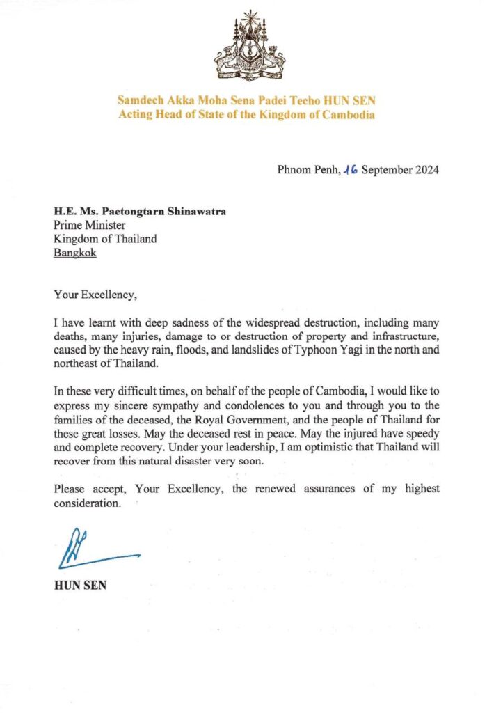 នារសៀលថ្ងៃទី១៦ ខែកញ្ញា ឆ្នាំ២០២៤ សម្តេចអគ្គមហាសេនាបតីតេជោ ហ៊ុន សែន ប្រមុខរដ្ឋស្ដីទីនៃព្រះរាជាណាចក្រកម្ពុជា ផ្ញើសារលិខិតចូលរួមរំលែកនូវសមានទុក្ខជូន លោកជំទាវ ផេថងថាន ស៊ីណាវ៉ាត្រា (Paetongtarn Shinawatra) នាយករដ្ឋមន្ត្រីនៃព្រះរាជាណាចក្រថៃ នូវសោកនាដកម្ម ការបាត់បង់អាយុជីវិត និងរងរបួសពលរដ្ឋជាច្រើន ការខូចខាតបំផ្លិចបំផ្លាញនូវទ្រព្យសម្បត្តិ និងហេដ្ឋារចនាសម្ព័ន្ធ ដែលបង្កដោយភ្លៀង ទឹកជំនន់ និងការបាក់ដីដ៏ធ្ងន់ធ្ងរ ដែលបណ្ដាលមកពីព្យុះកំណាច ទីហ្វុង យ៉ាគី នៅភាគខាងជើង និងឦសាននៃប្រទេសថៃ។