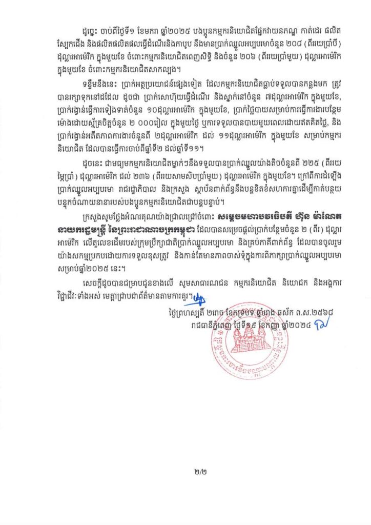 សេចក្តីប្រកាសព័ត៌មាន ស្តីពី ការកំណត់ប្រាក់ឈ្នួលអប្បបរមា សម្រាប់កម្មករនិយោជិត ផ្នែកវាយនភណ្ឌ កាត់ដេរ ផលិតស្បែកជើង និងផលិតផលធ្វើដំណើរ និងកាបួប សម្រាប់ឆ្នាំ២០២៥ ដោយមានចំនួន ២០៦ដុល្លារអាមេរិក ក្នុង១ខែ ដោយក្នុងនោះ សម្តេចធិបតី នាយករដ្ឋមន្ត្រី បានបន្ថែម ២ដុល្លារ សរុប ២០៨ដុល្លារអាមេរិក ក្នុង១ខែ។