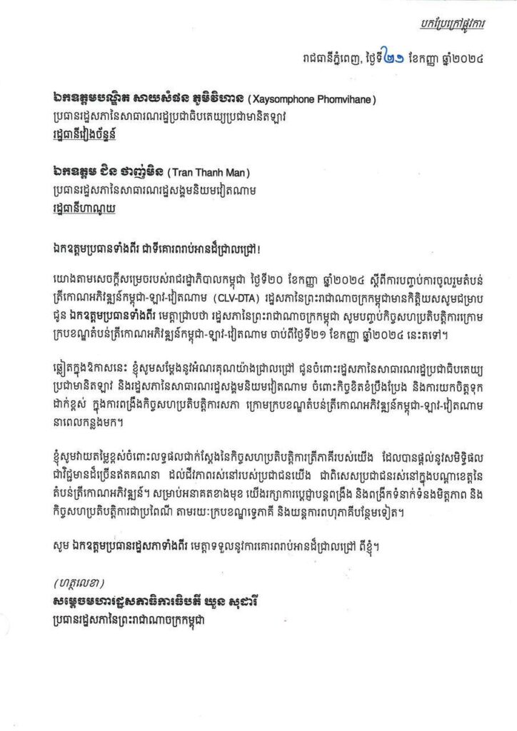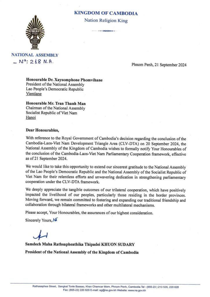 នារសៀលថ្ងៃទី២១ ខែកញ្ញា ឆ្នាំ២០២៤ សម្តេចមហារដ្ឋសភាធិការធិបតី ឃួន សុដារី ប្រធានរដ្ឋសភា នៃព្រះរាជាណាចក្រកម្ពុជា ផ្ញើសារលិខិតជូន ឯកឧត្តមបណ្ឌិត Xaysomphone Phomvihane ប្រធានរដ្ឋសភាឡាវ និង ឯកឧត្តម Tran Thanh Man ប្រធានរដ្ឋសភាវៀតណាម ដើម្បីជម្រាបជូនពីសេចក្តីសម្រេចរបស់រាជរដ្ឋាភិបាលកម្ពុជា កាលពីថ្ងៃទី២០ ខែកញ្ញា ឆ្នាំ២០២៤ ស្តីពីការបញ្ចប់ការចូលរួមតំបន់ ត្រីកោណអភិវឌ្ឍន៍កម្ពុជា-ឡាវ-វៀតណាម (CLV-DTA) ដូច្នេះហើយ រដ្ឋសភានៃព្រះរាជាណាចក្រកម្ពុជា សូមបញ្ចប់កិច្ចសហប្រតិបត្តិការក្រោមក្របខណ្ឌតំបន់ត្រីកោណអភិវឌ្ឍន៍កម្ពុជា-ឡាវ-វៀតណាម ចាប់ពីថ្ងៃទី២១ ខែកញ្ញា ឆ្នាំ២០២៤ នេះតទៅ សូមឯកឧត្ដមទទួលជ្រាប។
