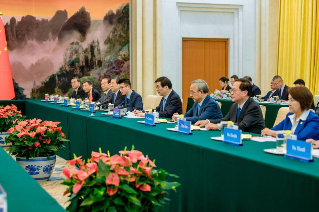 ប៉េកាំង៖ ថ្ងៃទី២៤ ខែកញ្ញា ឆ្នាំ២០២៤ សម្តេចមហារដ្ឋសភាធិការធិបតី ឃួន សុដារី ប្រធានរដ្ឋសភា នៃព្រះរាជាណាចក្រកម្ពុជា អញ្ជើញជួបពិភាក្សាការងារជាមួយ ឯកឧត្តម វ៉ាង ហ៊ូនីង (Wang Huning) ប្រធានគណៈកម្មាធិការជាតិនៃសភាប្រឹក្សានយោបាយប្រជាជនចិន នាព្រឹកថ្ងៃទី២៤ ខែកញ្ញា ឆ្នាំ២០២៤ នៅវិមានសភាតំណាងប្រជាជនចិន ក្នុងរដ្ឋធានីប៉េកំាង សាធារណរដ្ឋប្រជាមានិតចិន។