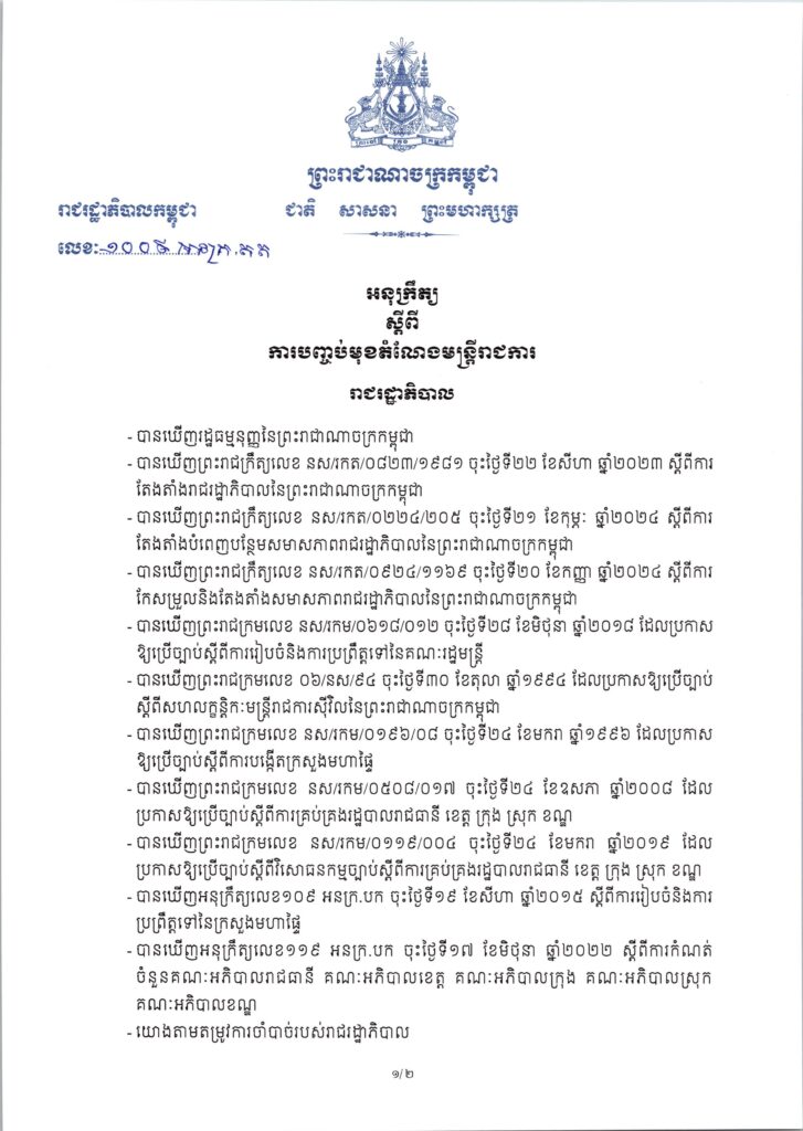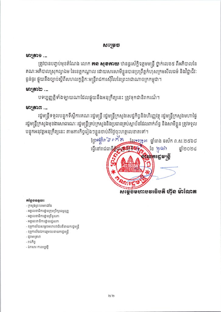 សម្តេចបវរធិបតី ហ៊ុន ម៉ាណែត ចេញអនុក្រឹត្យបញ្ចប់មុខតំណែងលោក កន សុខកាយ ពីអភិបាលស្រុកល្វាឯម ខេត្តកណ្តាល