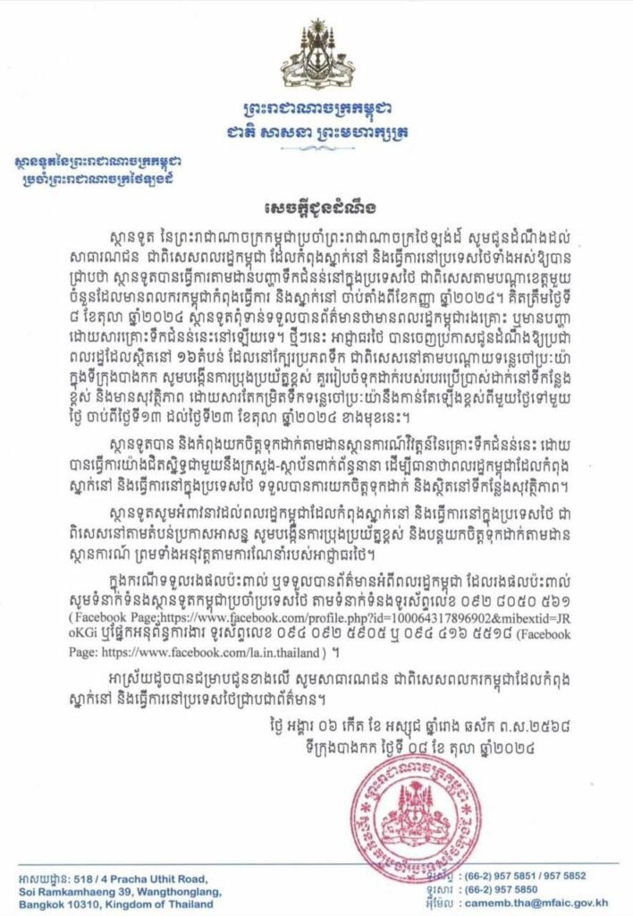ថ្ងៃទី៨ ខែតុលា ឆ្នាំ២០២៤ម្សិលមិញនេះ បានអំពាវនាវដល់ពលរដ្ឋខ្មែរដែលកំពុងរស់នៅ និងធ្វើការនៅប្រទេសថៃ ជាពិសេសនៅតាមតំបន់ប្រកាសអាសន្ន សូមបង្កើនការប្រុងប្រយ័ត្នខ្ពស់ និងបន្តយកចិត្តទុកដាក់តាមដានស្ថានការណ៍ព្រមទាំងអនុវត្តតាមការណែនាំរបស់អាជ្ញាធរថៃ ខណៈតំបន់ខ្លះជាពិសេសនៅជាប់ទន្លេចៅប្រះយ៉ាទីក្រុងបាងកក ទឹកជំនន់បានកំពុងហក់ឡើងខ្លាំង។