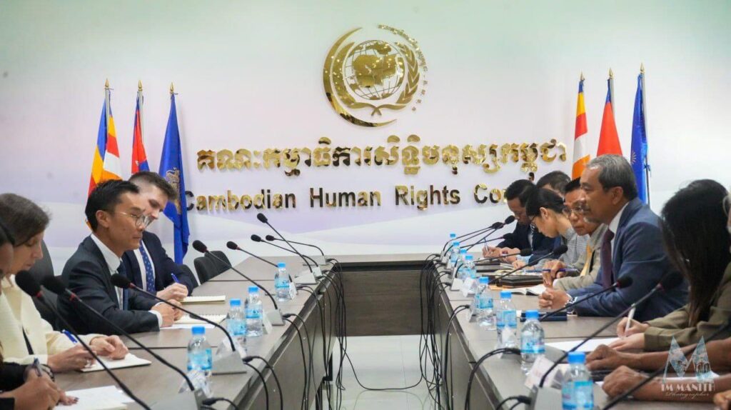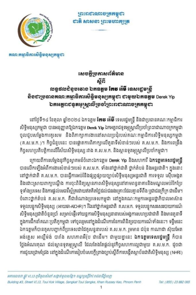 នៅថ្ងៃទី១៤ ខែតុលា ឆ្នាំ២០២៤ ឯកឧត្តម កែវ រ៉េមី ទេសរដ្ឋមន្ត្រី និងជាប្រធានគណៈកម្មាធិការ សិទ្ធិមនុស្សកម្ពុជា បានអនុញ្ញាតឱ្យឯកឧត្តម Derek Yip ឯកអគ្គរាជទូតអូស្ត្រាលីប្រចាំព្រះរាជាណាចក្រកម្ពុជា ចូលជួបសម្តែងការគួរសម និងពិភាក្សាការងារនៅសាលប្រជុំរបស់គណៈកម្មាធិការសិទ្ធិមនុស្សកម្ពុជា (គ.ស.ម.ក.)។ កិច្ចជំនួបនេះ បានផ្តោតការពិភាក្សាលើតួនាទីសំខាន់ៗរបស់ គ.ស.ម.ក. និងការពង្រឹង កិច្ចសហប្រតិបត្តិការលើវិស័យសិទ្ធិមនុស្ស រវាង គ.ស.ម.ក. និងស្ថានទូតអូស្ត្រាលីប្រចាំកម្ពុជា។