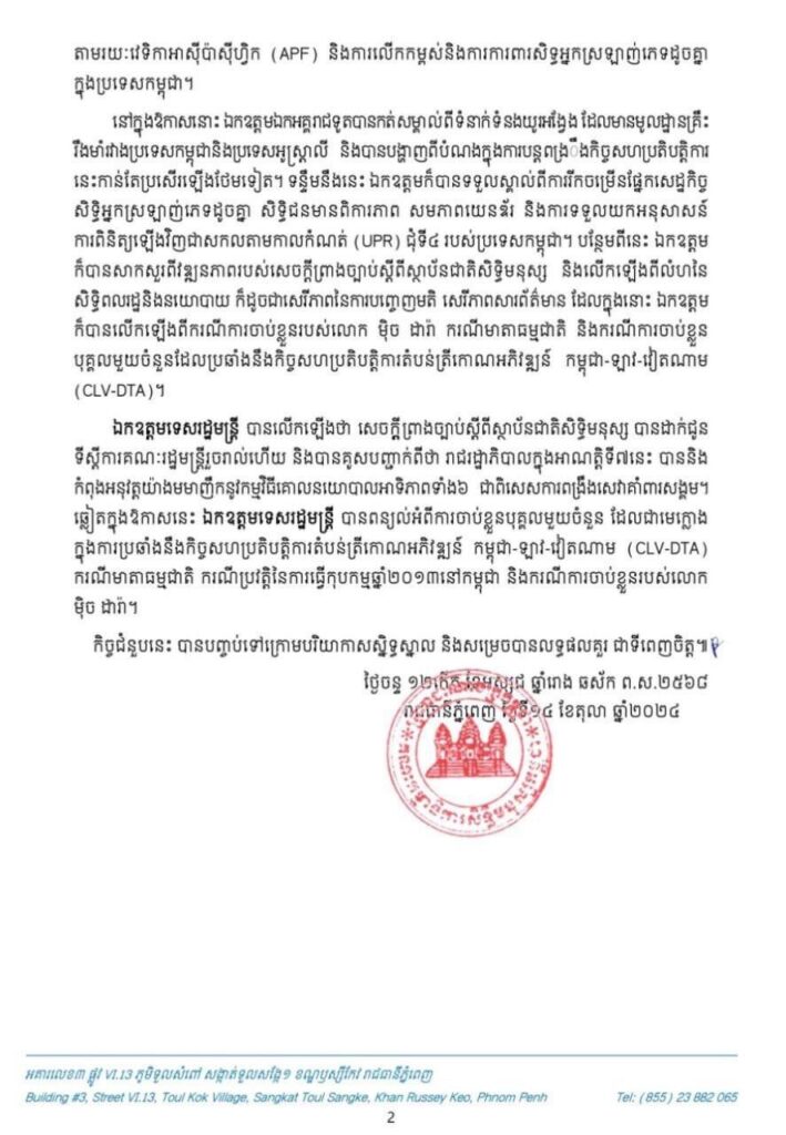 នៅក្នុងឱកាសនោះ ឯកឧត្តមឯកអគ្គរាជទូតបានកត់សម្គាល់ពីទំនាក់ទំនងយូរអង្វែង ដែលមានមូលដ្ឋានគ្រឹះ រឹងមាំរវាងប្រទេសកម្ពុជានិងប្រទេសអូស្ត្រាលី និងបានបង្ហាញពីបំណងក្នុងការបន្តពង្រនឹងកិច្ចសហប្រតិបត្តិការ នេះកាន់តែប្រសើរឡើងថែមទៀត។ ទន្ទឹមនឹងនេះ ឯកឧត្តមក៏បានទទួលស្គាល់ពីការរីកចម្រើនផ្នែកសេដ្ឋកិច្ច សិទ្ធិអ្នកស្រឡាញ់ភេទដូចគ្នា សិទ្ធិជនមានពិការភាព សមភាពយេនឌ័រ និងការទទួលយកអនុសាសន៍ ការពិនិត្យឡើងវិញជាសកលតាមកាលកំណត់ (UPR) ជុំទី៤ របស់ប្រទេសកម្ពុជា។ បន្ថែមពីនេះ ឯកឧត្តម ក៏បានសាកសួរពីវឌ្ឍនភាពរបស់សេចក្តីព្រាងច្បាប់ស្តីពីស្ថាប័នជាតិសិទ្ធិមនុស្ស និងលើកឡើងពីលំហនៃ សិទ្ធិពលរដ្ឋនិងនយោបាយ ក៏ដូចជាសេរីភាពនៃការបញ្ចេញមតិ សេរីភាពសារព័ត៌មាន ដែលក្នុងនោះ ឯកឧត្តម ក៏បានលើកឡើងពីករណីការចាប់ខ្លួនរបស់លោក ម៉ិច ដារ៉ា ករណីមាតាធម្មជាតិ និងករណីការចាប់ខ្លួន បុគ្គលមួយចំនួនដែលប្រឆាំងនឹងកិច្ចសហប្រតិបត្តិការតំបន់ត្រីកោណអភិវឌ្ឍន៍ កម្ពុជា-ឡាវ-វៀតណាម (CLV-DTA)។