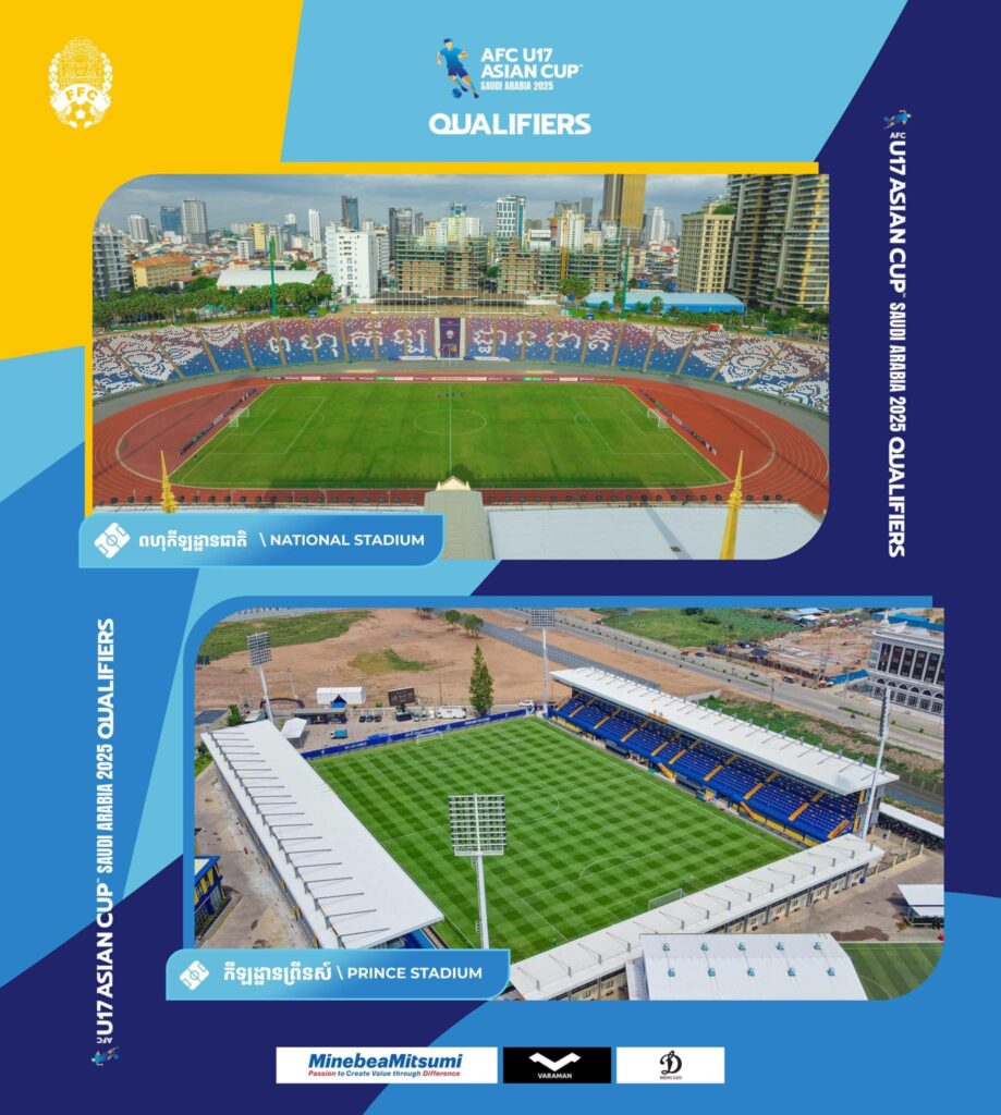 ការប្រកួតវគ្គជម្រុះនៃពានរង្វាន់ AFC U17 Asian Cup 2025 Qualifiers Group B ដែលប្រព្រឹត្តឡើងនៅរាជធានីភ្នំពេញ នឹងត្រូវរៀបចំធ្វើនៅកីឡដ្ឋានចំនួន២ ដែលការប្រកួតថ្ងៃទី១៩ ២១ និង ២៣ ខែតុលា ឆ្នាំ២០២៤ នៅពហុកីឡដ្ឋានជាតិ (អូឡាំពិក) និងការប្រកួតថ្ងៃទី២៥ និង ២៧ ខែតុលា ឆ្នាំ២០២៤ នៅកីឡដ្ឋានព្រីនស៍ របស់ក្លិបបាល់ទាត់វិសាខា។