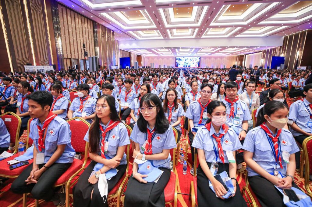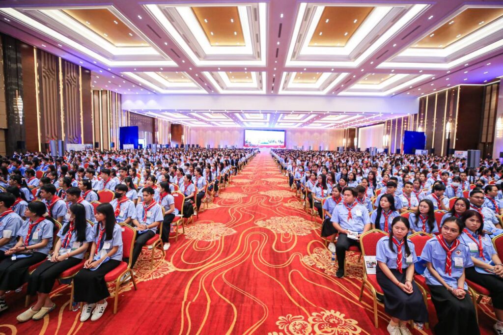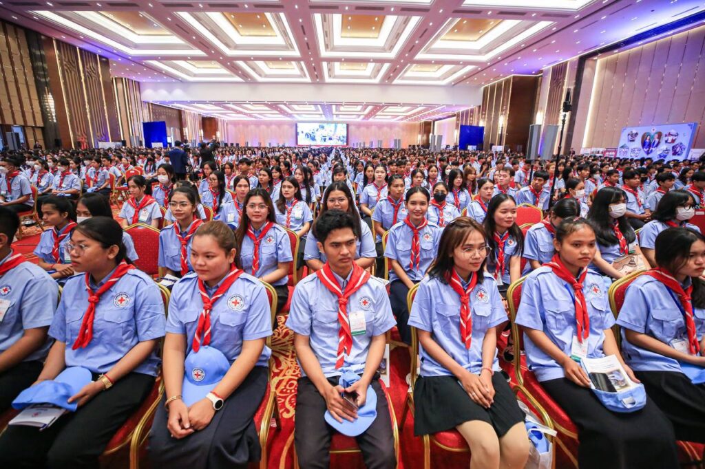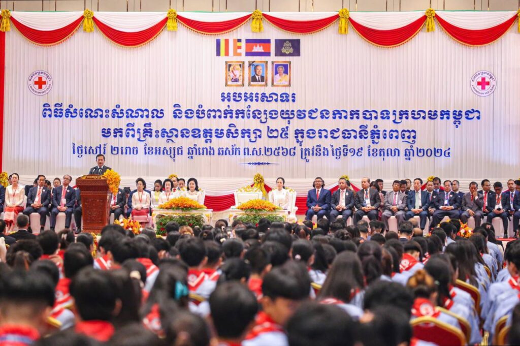 ភ្នំពេញ៖ ថ្ងៃទី១៩ ខែតុលា ឆ្នាំ២០២៤ សម្តេចមហាបវរធិបតី ហ៊ុន ម៉ាណែត នាយករដ្ឋមន្ត្រី នៃព្រះរាជាណាចក្រកម្ពុជា សម្តេចកិត្តិព្រឹទ្ធបណ្ឌិត ប៊ុន រ៉ានី ហ៊ុន សែន ប្រធានកាកបាទក្រហមកម្ពុជា និងលោកជំទាវបណ្ឌិត ពេជ ចន្ទមុន្នី អញ្ជើញជាអធិបតី ពិធីសំណេះសំណាល និងបំពាក់កន្សែងយុវជនកាកបាទក្រហមកម្ពុជា ចំនួន ៤ ៧៤២នាក់ មកពីគ្រឹះស្ថានឧត្តមសិក្សា ២៥ ក្នុងរាជធានីភ្នំពេញ នាព្រឹកថ្ងៃទី១៩ ខែតុលា ឆ្នាំ២០២៤ នៅមជ្ឈមណ្ឌលសន្និបាត និងពិព័រណ៍កោះពេជ្រ។
