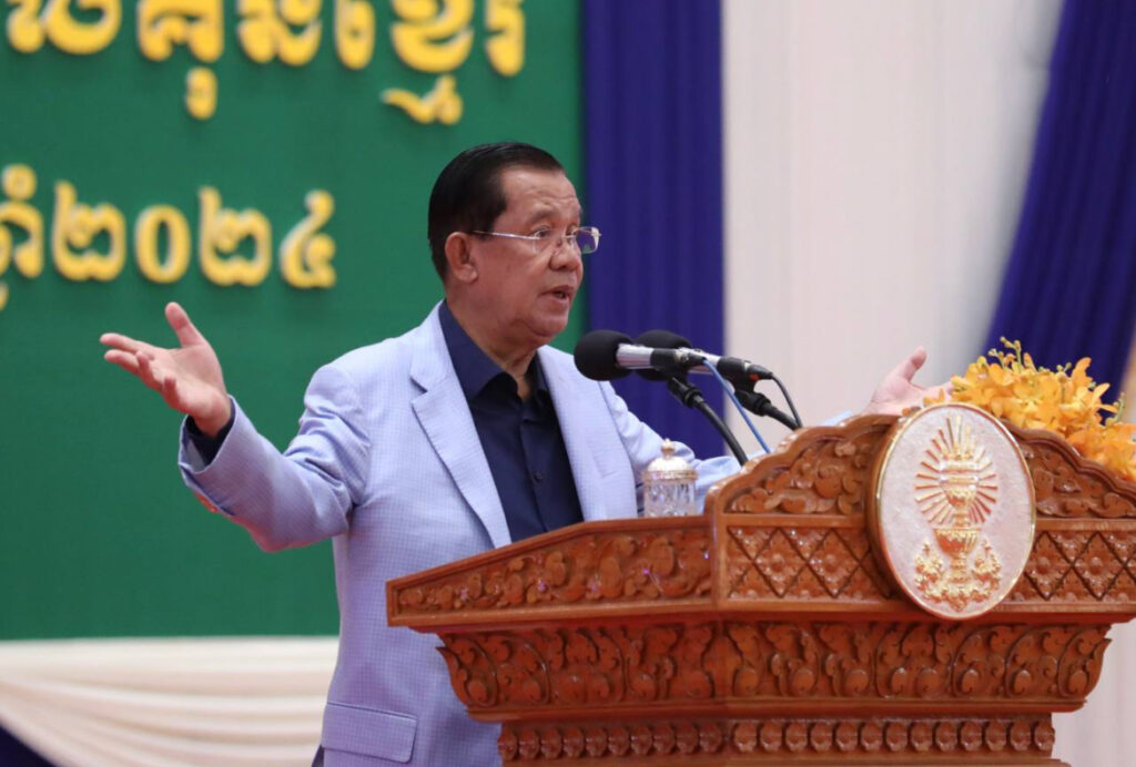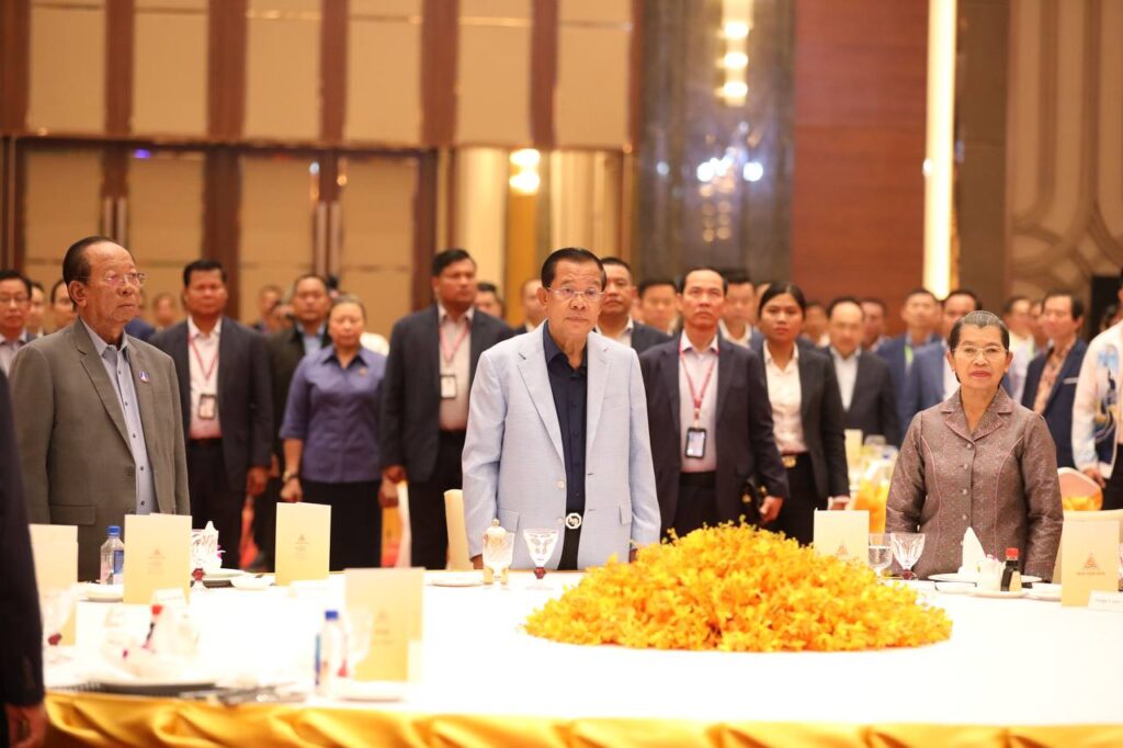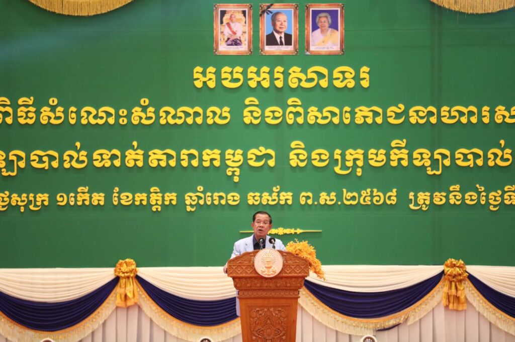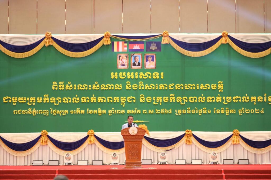 ភ្នំពេញ៖ ថ្ងៃទី០១ ខែវិច្ឆិកា ឆ្នាំ២០២៤ សម្តេចអគ្គមហាសេនាបតីតេជោ ហ៊ុន សែន ប្រធានព្រឹទ្ធសភានៃព្រះរាជាណាចក្រកម្ពុជា អញ្ជើញជួបសំណេះសំណាល និងពិសាអាហារសាមគ្គី ជាមួយក្រុមកីឡាបាល់ទាត់តារាកម្ពុជា និងក្រុមកីឡាបាល់ទាត់ប្រដាល់ក្បាច់គុនខ្មែរ នៅមជ្ឈមណ្ឌលសន្និសីទ និងពិព័រណ៌អន្តរជាតិជ្រោយចង្វារ រាជធានីភ្នំពេញ នាល្ងាចថ្ងៃទី០១ ខែវិច្ឆិកា ឆ្នាំ២០២៤។