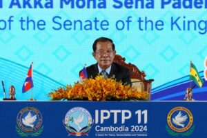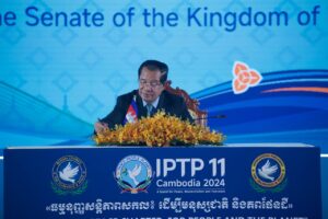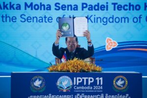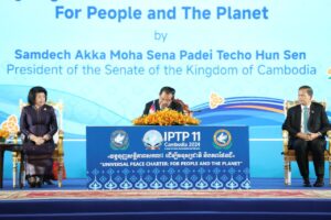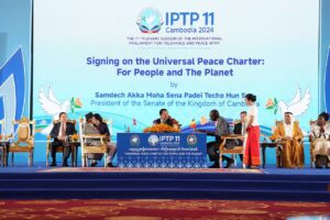ភ្នំពេញ៖ ថ្ងៃទី២៤ ខែវិច្ឆិកា ឆ្នាំ២០២៤ សម្តេចអគ្គមហាសេនាបតីតេជោ ហ៊ុន សែន ប្រធានព្រឹទ្ធសភានៃព្រះរាជាណាចក្រកម្ពុជា អញ្ជើញចុះហត្ថលេខាលើ " ធម្មនុញ្ញសន្តិភាពសកល៖ ដើម្បីមនុស្សជាតិ និងភពផែនដី " ដែលប្រព្រឹត្តទៅក្នុងពិធីបើកសម័យប្រជុំពេញអង្គសភាអន្តរជាតិដើម្បីភាពអត់ឱន និងសន្តិភាព (IPTP) លើកទី១១ នាព្រឹកថ្ងៃទី២៤ ខែវិច្ឆិកា ឆ្នាំ២០២៤ នៅសណ្ឋាគារសុខាភ្នំពេញ។