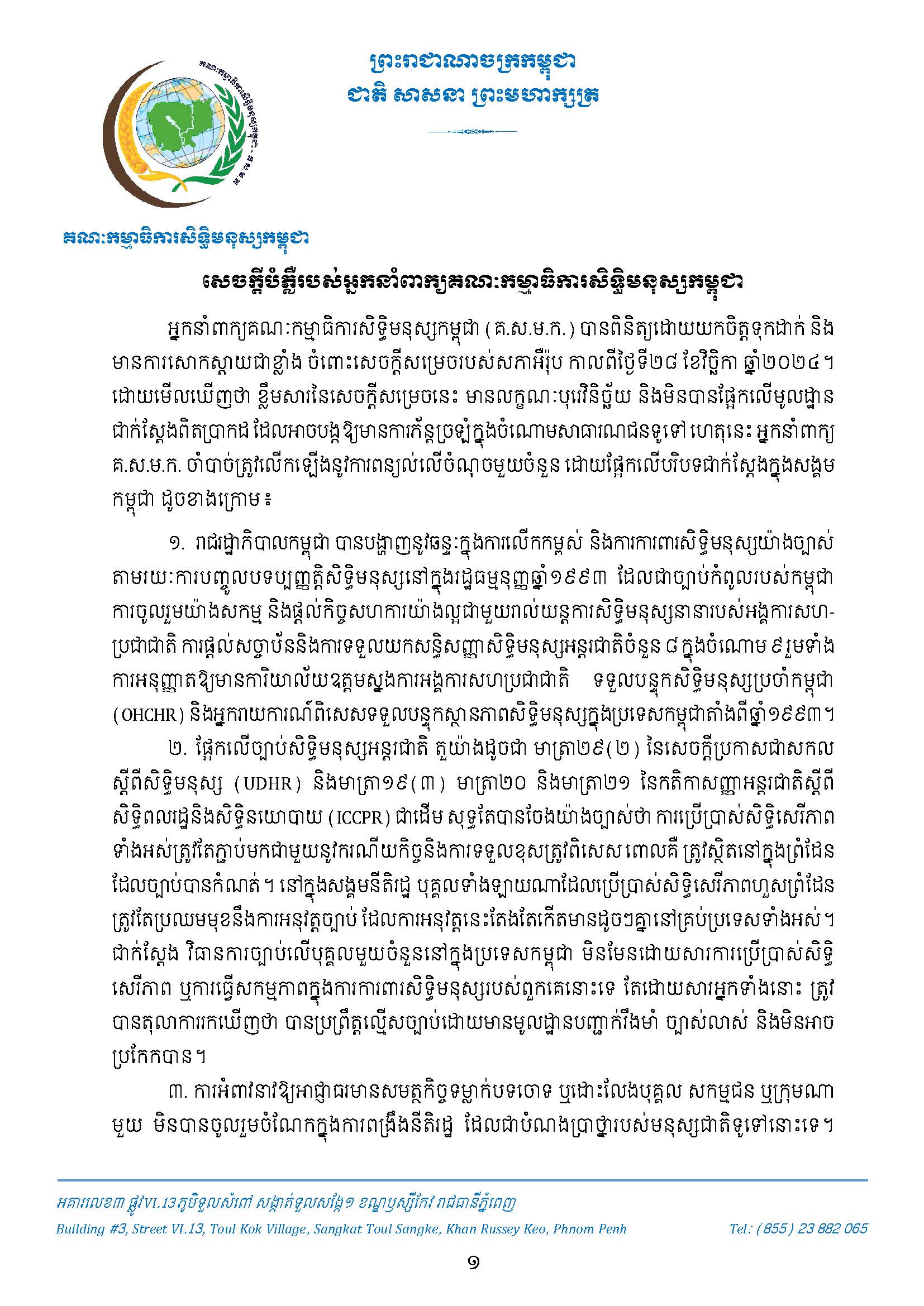 សេចក្តីបំភ្លឺរបស់អ្នកនាំពាក្យគណៈកម្មាធិការសិទ្ធមនុស្សកម្ពុជា