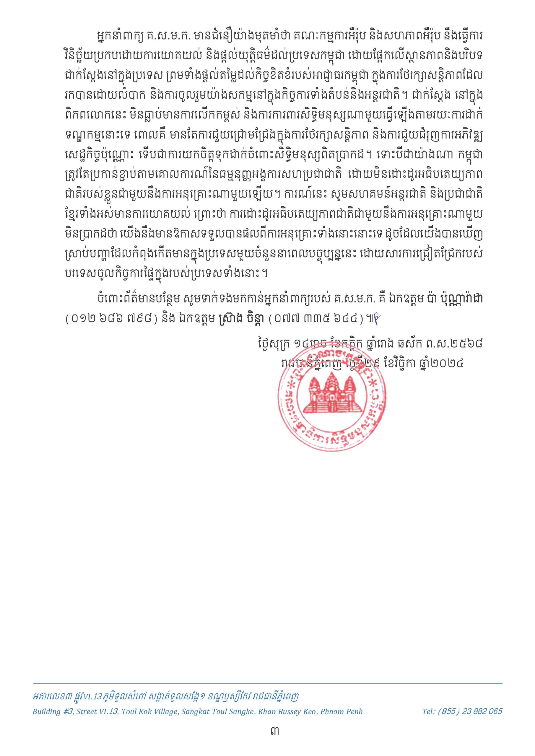អ្នកនាំពាក្យគណៈកម្មាធិការសិទ្ធមនុស្សកម្ពុជា (គ.ស.ម.ក) បានពិនិត្យយ៉ាងយកដាក់ និងមានការសោកស្តាយជាខ្លាំង ចំពោះសេចក្តីសម្រេចរបស់សភាអឺរ៉ុប កាលពីថ្ងៃទី២៨ ខែវិច្ឆិកា ឆ្នាំ២០២៤។