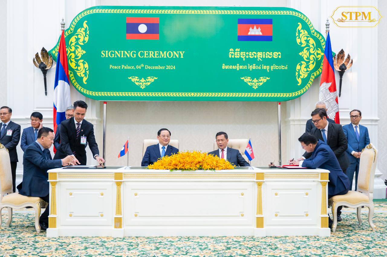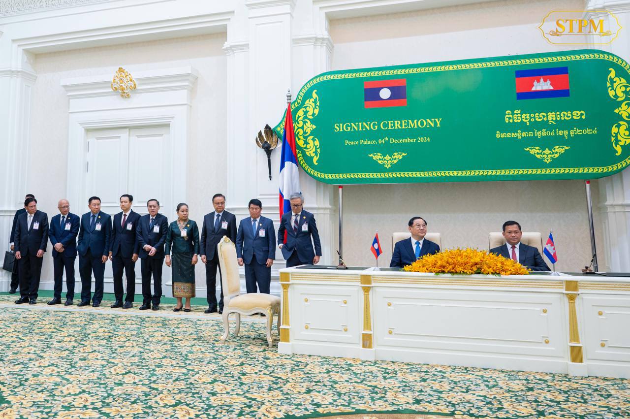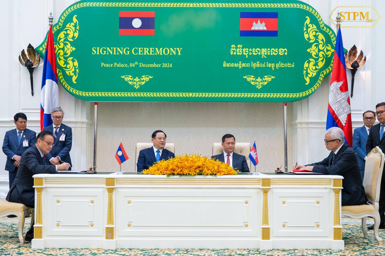 រាជធានីភ្នំពេញ៖ រសៀលថ្ងៃពុធ ទី៤ ធ្នូ ២០២៤ សម្តេចមហាបវរធិបតី ហ៊ុន ម៉ាណែត នាយករដ្ឋមន្ត្រី នៃព្រះរាជាណាចក្រកម្ពុជា អញ្ជើញចូលរួមជាអធិបតីភាពក្នុងជំនួបជាមួយ ឯកឧត្តមបណ្ឌិត សនសៃ ស៊ីផាន់ដន (Sonexay SIPHANDONE) នាយករដ្ឋមន្ត្រី នៃសាធារណរដ្ឋប្រជាធិបតេយ្យប្រជាមានិតឡាវ ក្នុងពិធីចុះអនុស្សរណៈនៃការយោគយល់គ្នារវាងរដ្ឋាភិបាលកម្ពុជា និងរដ្ឋាភិបាលនៃសាធារណរដ្ឋប្រជាធិប តេយ្យប្រជាមានិតឡាវ ចំនួនបី៖