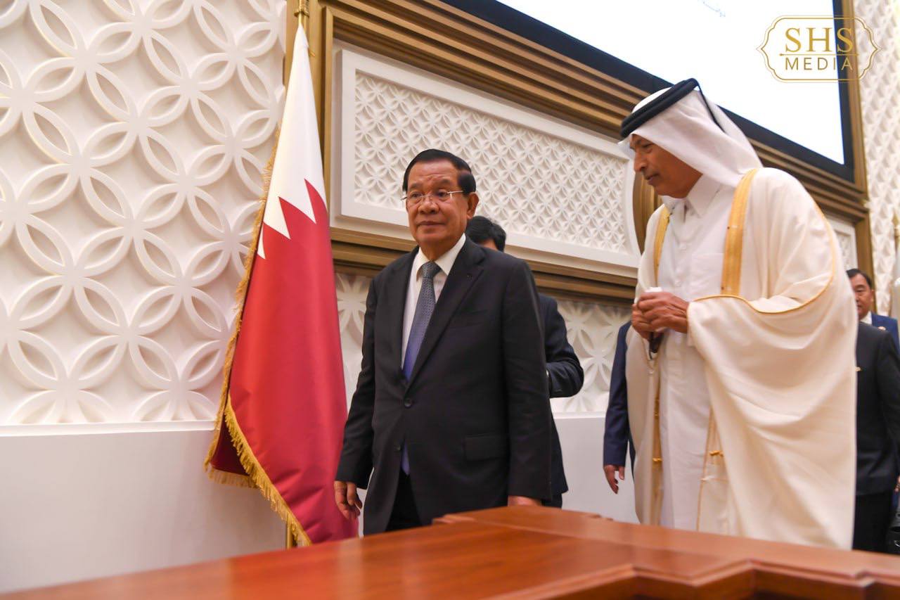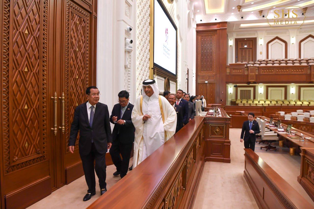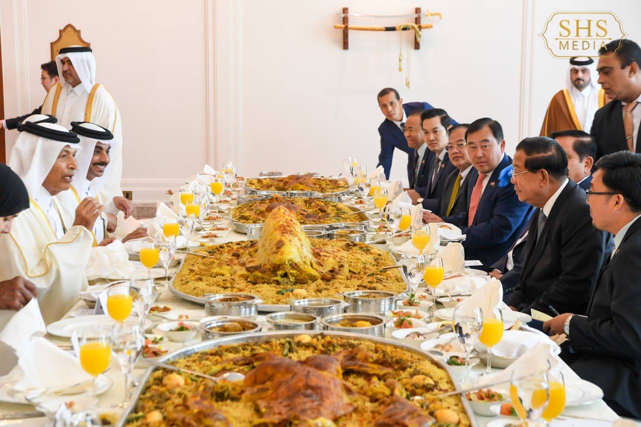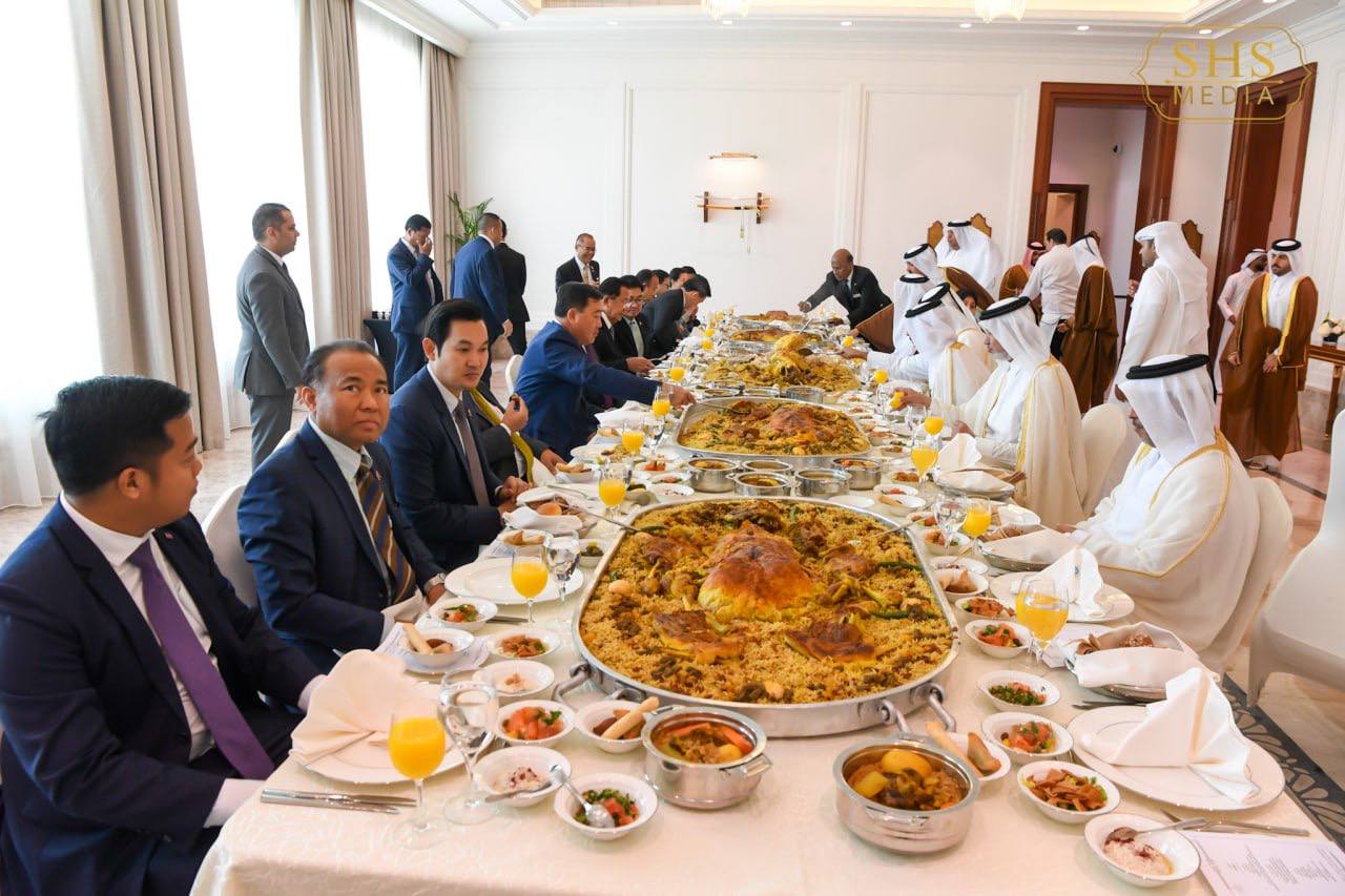 ដូហា៖ ថ្ងៃទី១០ ខែធ្នូ ឆ្នាំ២០២៤ សម្តេចអគ្គមហាសេនាបតីតេជោ ហ៊ុន សែន ប្រធានព្រឹទ្ធសភា នៃព្រះរាជាណាចក្រកម្ពុជា និងគណៈប្រតិភូជាន់ខ្ពស់ អញ្ជើញចូលរួមពិធីលៀងសាយភោជន៍ថ្ងៃត្រង់រៀបចំដោយឯកឧត្តម ហាសសាន ប៊ីន អាប់ឌុលឡា អាល់ហ្កានីម (Hassan Bin Abdulla Al-Ghanim) ប្រធានរដ្ឋសភា រដ្ឋកាតា ជាមហាកិត្តិយដ៏ខ្ពស់ខ្ពស់បំផុត ជូនសម្តេចតេជោ ហ៊ុន សែន នៅរដ្ឋធានីដូហា រដ្ឋកាតា នាថ្ងៃទី១០ ខែធ្នូ ឆ្នាំ២០២៤។