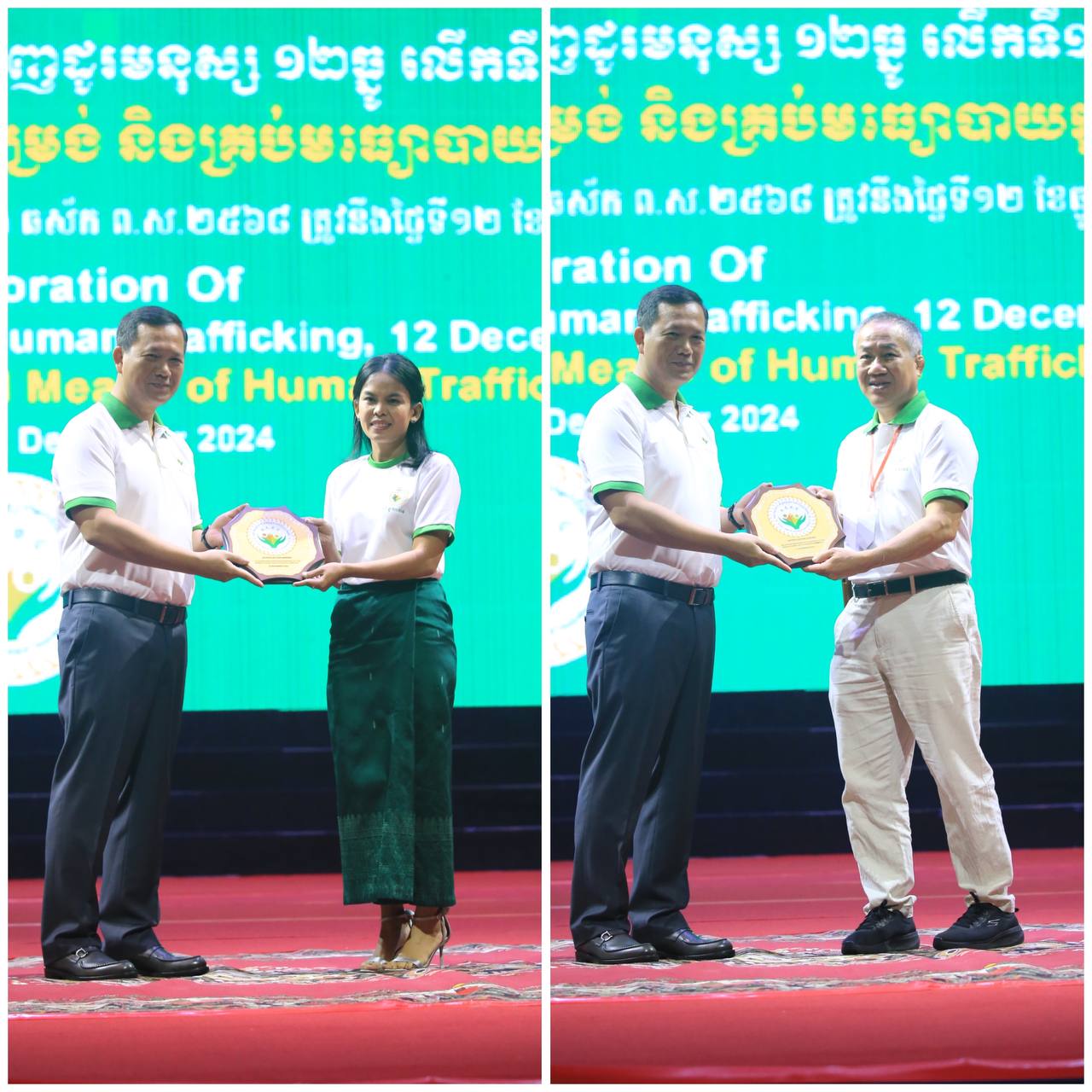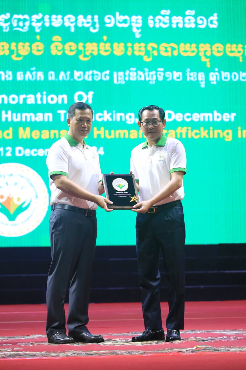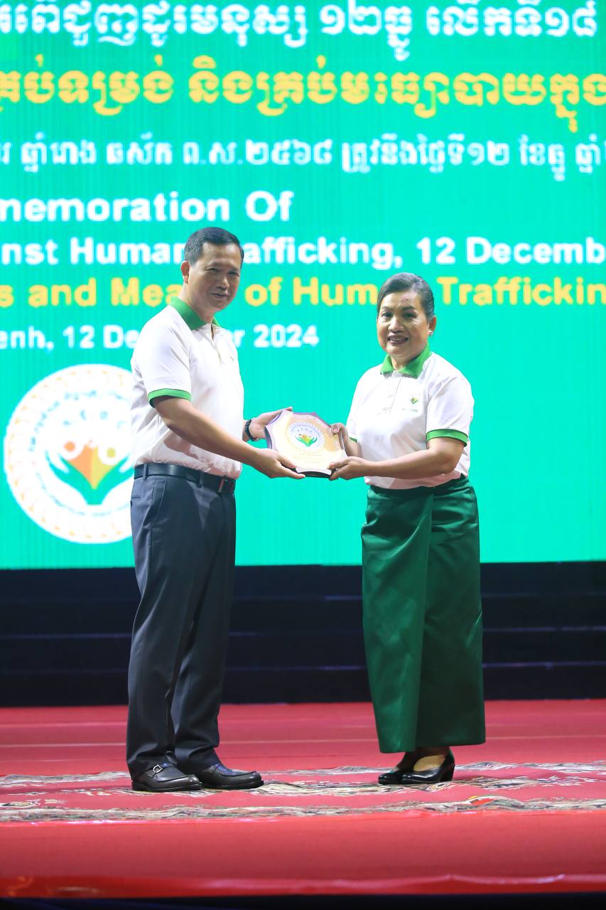 ភ្នំពេញ៖ ថ្ងៃទី១២ ខែធ្នូ ឆ្នាំ២០២៤ សម្តេចមហាបវរធិបតី ហ៊ុន ម៉ាណែត នាយករដ្ឋមន្ត្រី នៃព្រះរាជាណាចក្រកម្ពុជា អញ្ជើញប្រគល់ពានកិត្តិយសដល់ក្រសួង ស្ថាប័ន ដែលដឹកនាំការងារប្រយុទ្ធប្រឆាំងអំពើជួញដូរមនុស្ស ក្នុងឱកាសទិវាជាតិប្រឆាំងការជួញដូរមនុស្ស ១២ធ្នូ លើកទី១៨ ក្រោមប្រធានបទ "កម្ពុជាប្រឆាំងដាច់ខាតអំពើជួញដូរមនុស្សគ្រប់ទម្រង់ និងគ្រប់មធ្យោបាយក្នុងយុគសម័យឌីជីថល!" នាព្រឹកថ្ងៃទី១២ ខែធ្នូ ឆ្នាំ២០២៤ នៅមជ្ឈមណ្ឌលសន្និបាត និងពិព័រណ៍កោះពេជ្រ រាជធានីភ្នំពេញ។