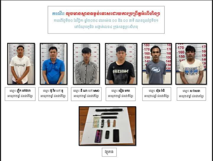 កម្លាំងនាយកដ្ឋាននគរបាលព្រហ្មទណ្ឌ បង្ក្រាបករណីប្លន់ជនបរទេសយកទ្រព្យសម្បត្តិនៅក្រុងព្រះសីហនុ, ជនដៃដល់៦នាក់ត្រូវចាប់ខ្លួនបានជាបន្ដបន្ទាប់