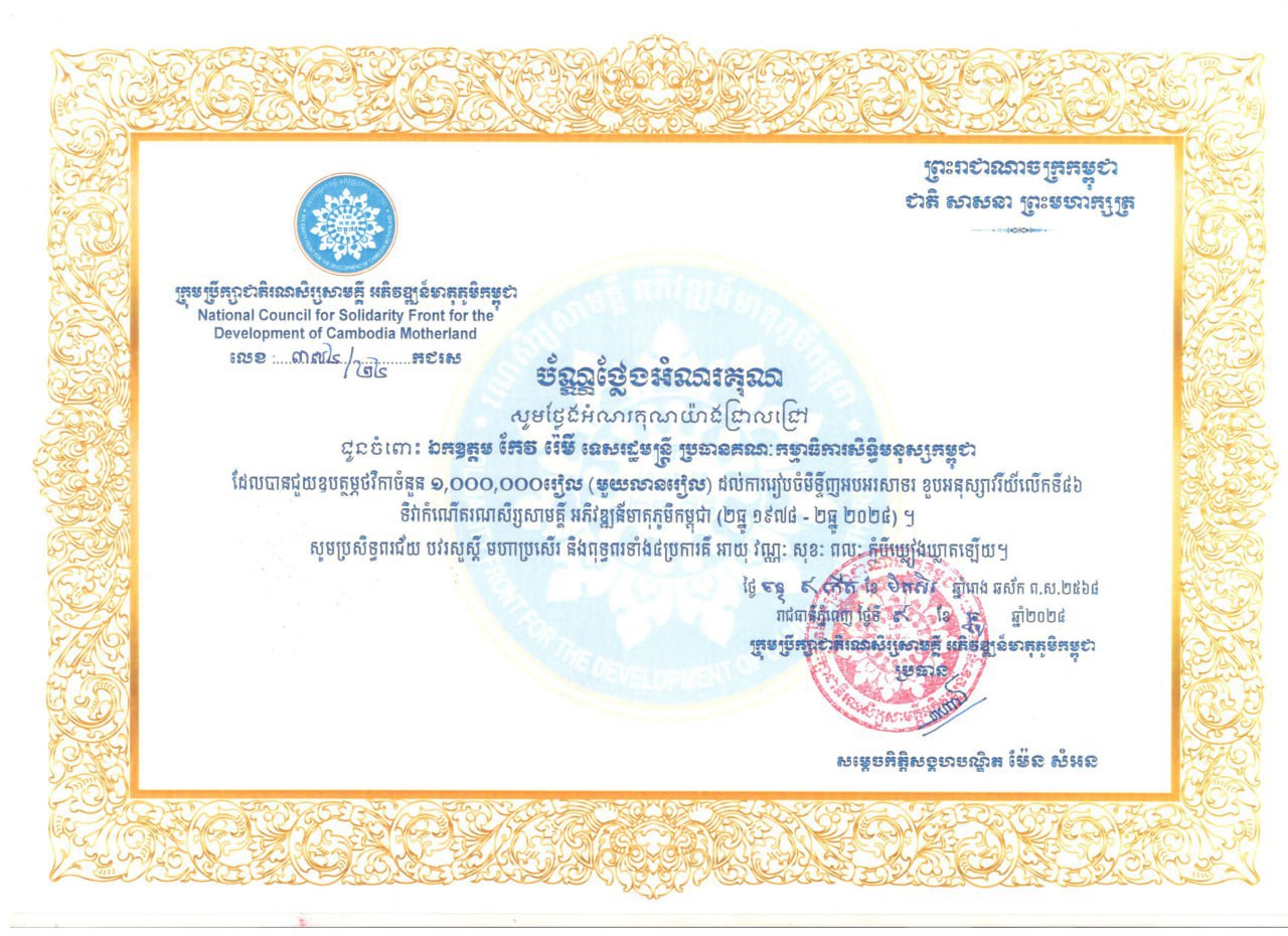 ឯកឧត្តម ទេសរដ្ឋមន្ត្រី កែវ រ៉េមី ទទួលបានប័ណ្ណថ្លែងអំណរគុណ របស់ក្រុមប្រឹក្សារណសិរ្យសាមគ្គី អភិវឌ្ឍន៍មាតុភូមិកម្ពុជា