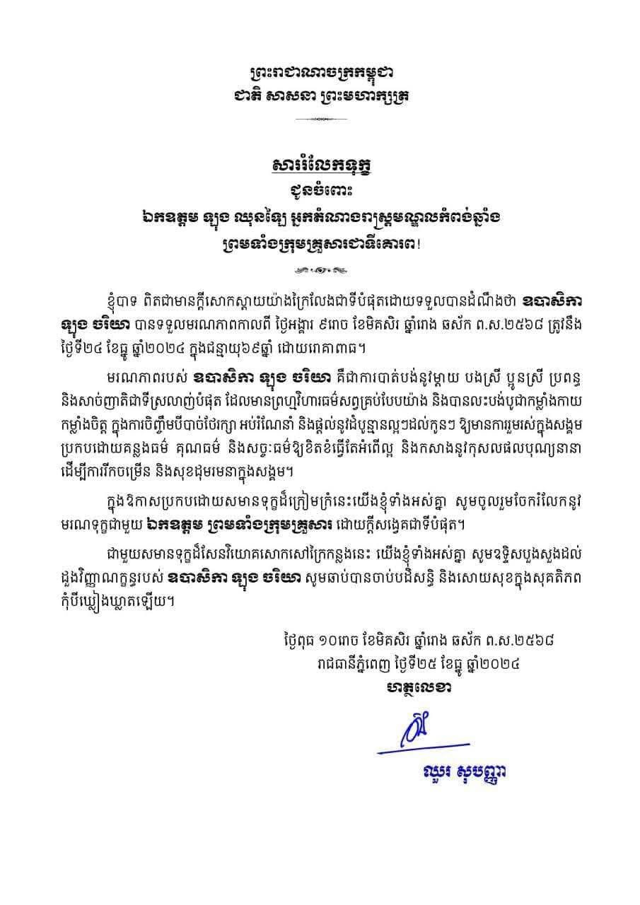 ឯកឧត្តម ឡុង ឈុនឡៃ អ្នកតំណាងរាស្រ្តមណ្ឌលកំពង់ឆ្នាំងបានថ្លែងអំណរគុណដល់ឯកឧត្តម ឈួរ សុបញ្ញា រដ្ឋលេខាធិការ ក្រសួងធម្មការ និង សាសនា ដែលបានផ្ញើសាររំលែកនិងថវិកាចូលបុណ្យ ដល់ឯកឧត្តម ព្រមទាំងក្រុមគ្រួសារ ដែលឧបាសិកា ឡុង ចរិយា ហៅ ណៃ ត្រូវជាប្អូន បង្កើតឯកឧត្តម បានទទួលមរណភាពនៅវេលាម៉ោង១០និង៣០បាទី ថ្ងៃទី ២៤ ខែធ្នូ ឆ្នាំ២០២៤ដោយរោគាពាធ។