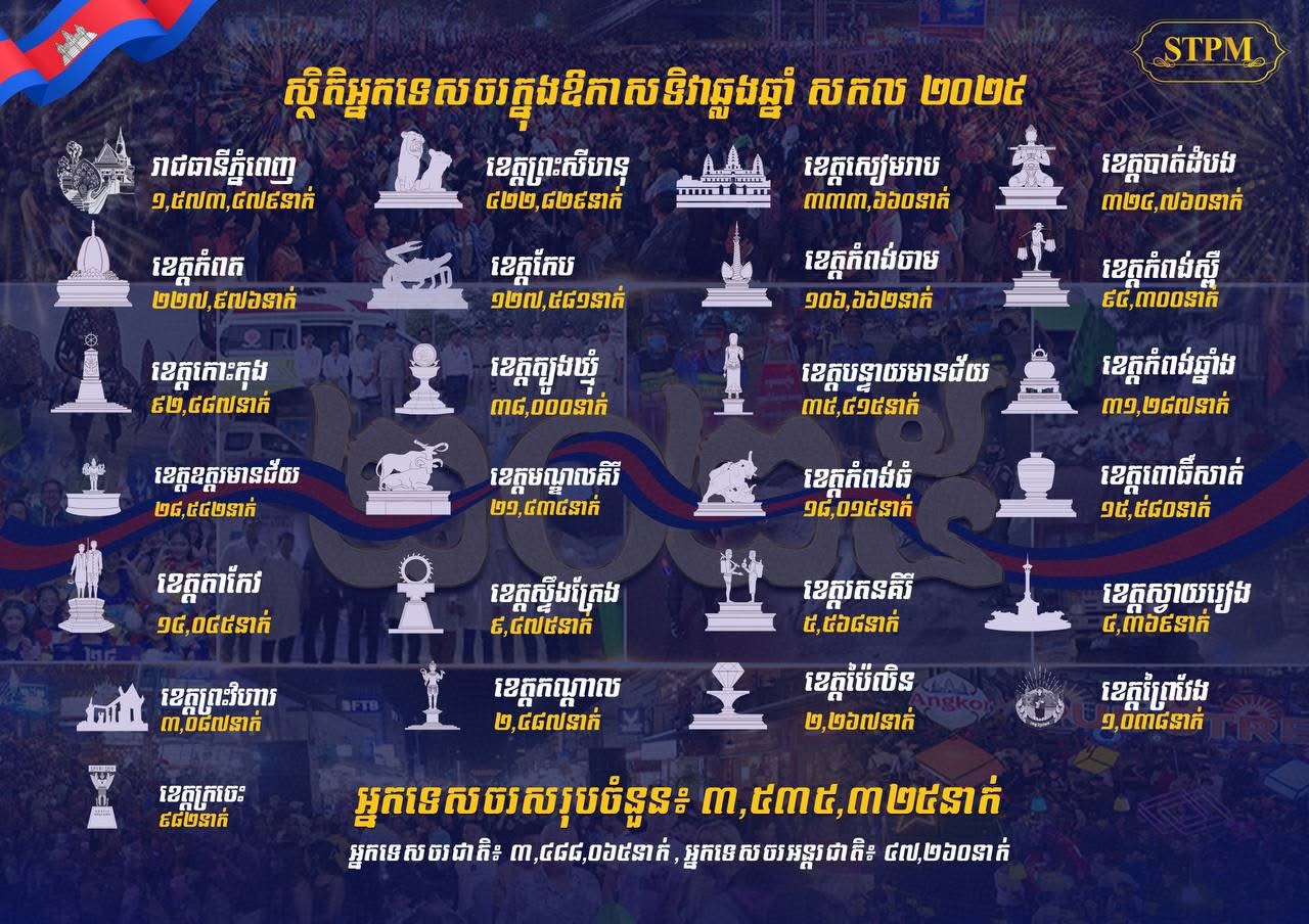 គិតត្រឹមថ្ងៃទី២ ខែមករា ឆ្នាំ២០២៥នេះ យោងតាមស្ថិតិទេសចរជាតិ និងអន្តរជាតិ ដើរលេងកម្សាន្តទូទាំងប្រទេស ក្នុងឱកាសឆ្លងឆ្នាំសកល នៅតាមបណ្ដារាជធានី-ខេត្ត ចាប់ពីថ្ងៃទី៣០-៣១ ខែធ្នូ ឆ្នាំ២០២៤ មានដូចជា៖