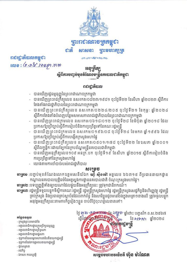 នារសៀលថ្ងៃទី៥ ខែមេសា ឆ្នាំ២០២៤នេះ សម្តេចធិបតី ហ៊ុន ម៉ាណែត នាយករដ្ឋមន្ត្រី នៃព្រះរាជាណាចក្រកម្ពុជា សម្រេចចេញអនុក្រឹត្យបញ្ចប់មុខតំណែង ឧត្តមសេនីយ៍ឯក យ៊ាំ ស៊ីងម៉ៅ ពីប្រធាននាយកដ្ឋានកណ្តាលនគរបាលយុត្តិធម៌ នៃអគ្គស្នងការដ្ឋាននគរបាលជាតិ ។