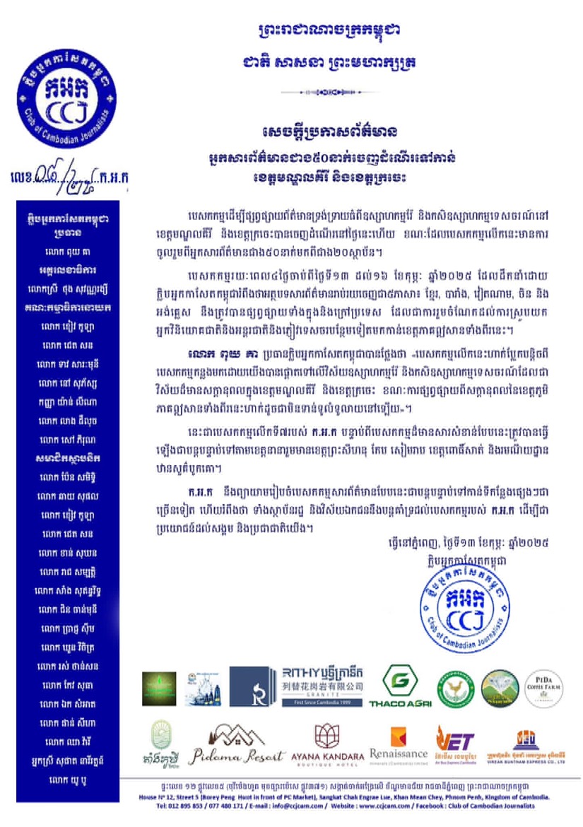 បេសកកម្មរយៈពេល៤ថ្ងៃចាប់ពីថ្ងៃទី១៣ ដល់១៦ ខែកុម្ភៈឆ្នាំ២០២៥ ដែលដឹកនាំដោយ ក្លិបអ្នកកាសែតកម្ពុជារំពឹងថាអត្ថបទសារព័ត៌មានរាប់រយចេញជា៥ភាសា៖ ខ្មែរ, បារាំង, វៀតណាម, ចិននិងអង់គ្លេស នឹងត្រូវបានផ្សព្វផ្សាយទាំងក្នុងនិងក្រៅប្រទេស ដែលជាការរួមចំណែកដល់ការស្រូបយកអ្នកវិនិយោគជាតិនិងអន្តរជាតិនិងភ្ញៀវទេសចរបន្ថែមទៀតមកកាន់ខេត្តភាគឦសានទាំងពីរនេះ។