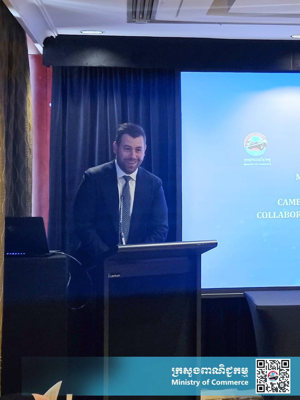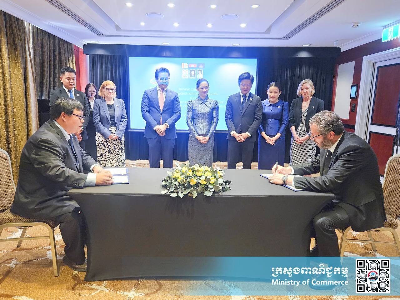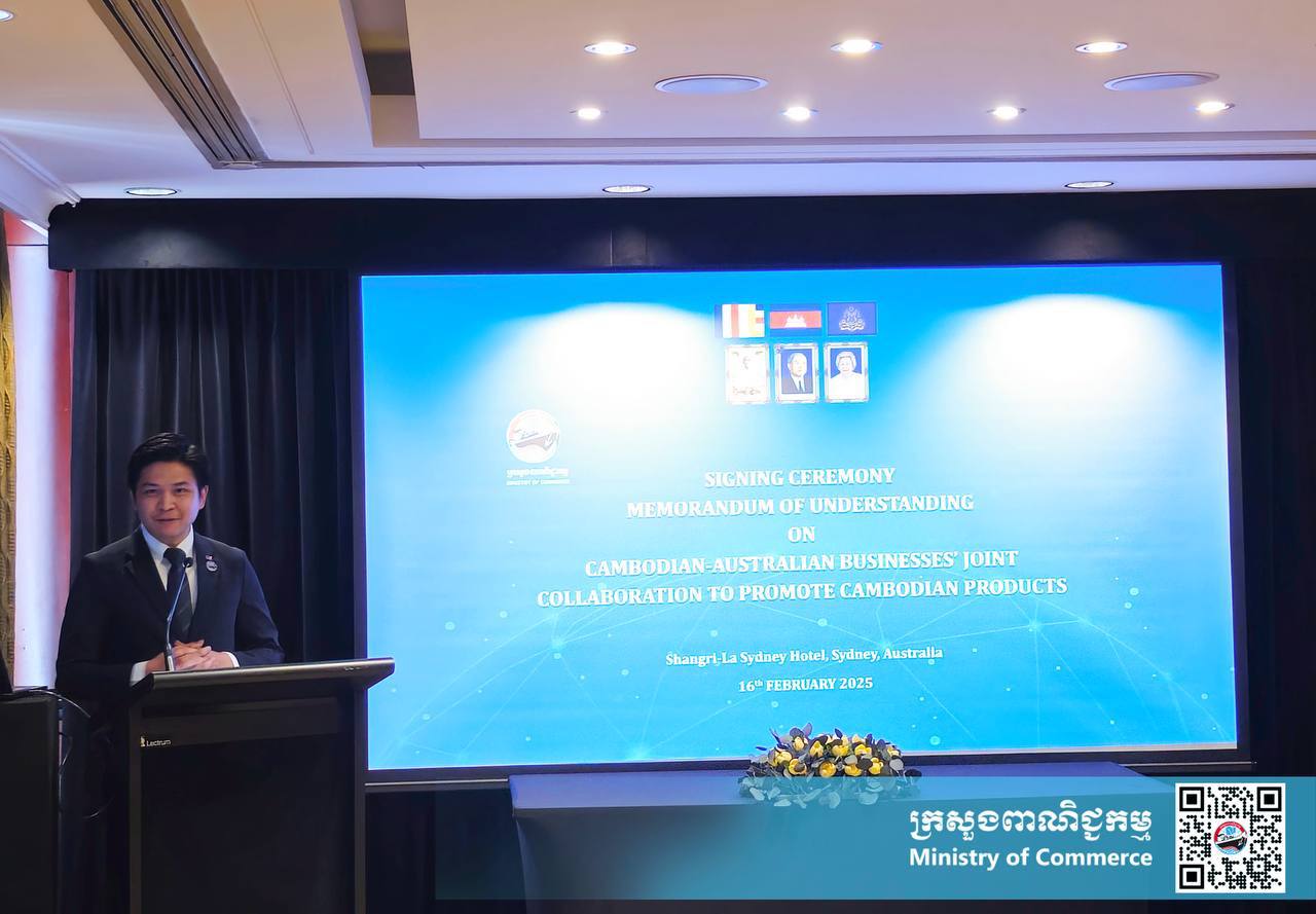 ស៊ីដនី៖ ថ្ងៃទី១៦ ខែកុម្ភៈ ឆ្នាំ២០២៥ លោកជំទាវ ចម និម្មល រដ្ឋមន្ត្រីក្រសួងពាណិជ្ជកម្ម នៃព្រះរាជាណាចក្រកម្ពុជា អញ្ជើញជាអធិបតីពិធីចុះហត្ថលេខា លើអនុស្សរណៈ នៃការយោគយល់គ្នា ស្តីពីកិច្ចសហការរួមគ្នារវាង ធុរកិច្ចកម្ពុជា-អូស្ត្រាលី ក្នុងការលើកកម្ពស់ផលិតផលកម្ពុជា នាព្រឹកថ្ងៃអាទិត្យ ទី១៦ ខែកុម្ភៈ ឆ្នាំ២០២៥ ទីក្រុងស៊ីដនី ប្រទេសអូស្ត្រាលី។