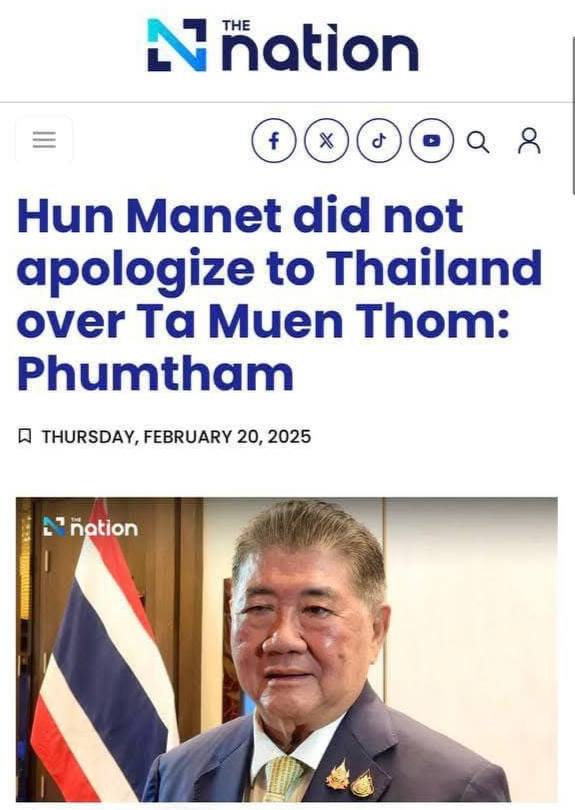 រដ្ឋមន្ត្រីក្រសួងការពារជាតិថៃ បានចេញមកបញ្ជាក់ថា សម្តេចធិបតី ហ៊ុន ម៉ាណែត មិនបានទូរស័ព្ទទៅសុំទោសពាក់ព័ន្ធនឹងរឿងរ៉ាវដែលបានកើតឡើងនៅប្រាសាទតាមាន់ធំដូចដែលសារព័ត៌មាននៅប្រទេសថៃមួយចំនួនបានផ្សាយនោះទេ