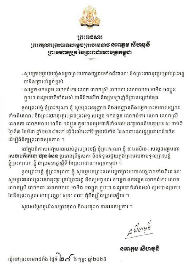 ព្រះករុណា ព្រះបាទសម្ដេចព្រះបរមនាថ នរោត្ដម សីហមុនី ព្រះមហាក្សត្រ នៃព្រះរាជាណាចក្រកម្ពុជា ជាទីគោរពសក្ការៈដ៏ខ្ពង់ខ្ពស់បំផុត ព្រះអង្គសព្វព្រះរាជហឬទ័យ ស្តេចនឹងយាងទៅទីក្រុងប៉េកាំងសាធារណរដ្ឋប្រជាមានិតចិន ដើម្បីពិនិត្យព្រះរាជសុខភាព នៅព្រឹកថ្ងៃទី០៣ ខែមីនា ឆ្នាំ២០២៥ ស្អែកនេះ។