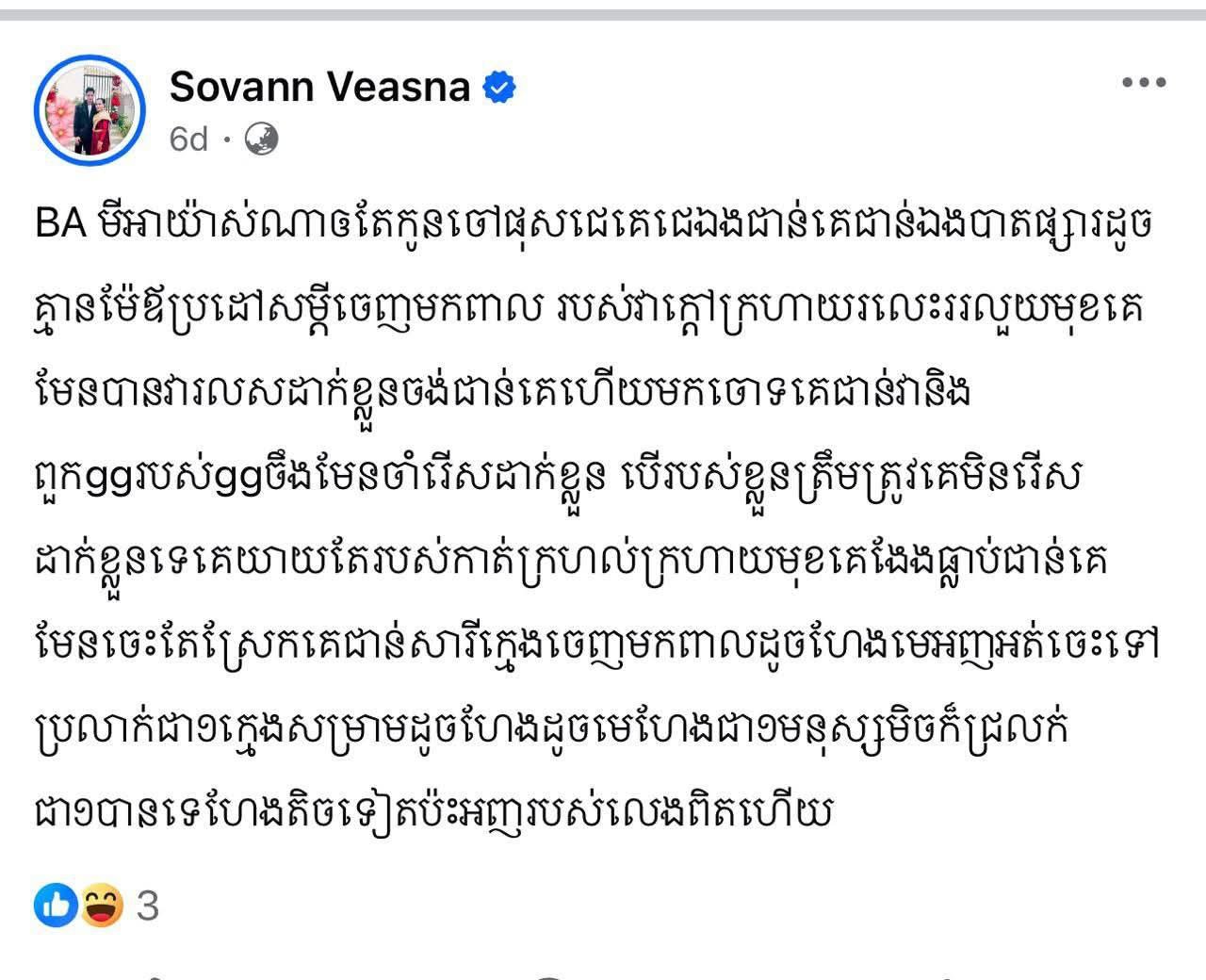 ទង្វើររបស់បុគ្គលខាងលើនេះគឺជាបញ្ហាដែរសង្គមស្អប់ខ្ពើម ដោយខ្លួនត្រឹមជាអ្នកប្រម៉ូតផលិតផលសោះ តែបែជាជេរបញ្ចោរពេញក្នុងបណ្តាញសង្គម រហូតបានវាស់កំពស់បញ្ជូនទៅតុលាការ តើមានអ្នកណាដែរជាអ្នកបញ្ជារអោយជននេះតែងតែជេរបញ្ចោរតាមបណ្តាញសង្គមបែបនេះ? ដោយបុគ្គលនេះតែងតែនិយាយថាមេនេះមេនោះនៅពីក្រោយខ្នង តើមេនៅពីក្រោយខ្នងជាអ្នកណា? មានឋានះបុណ្យសក្កិធំប៉ុណ្ណា? បានជាបុគ្គលខាងលើហ៊ានធ្វើទង្វើអសីលធម៍បែបនេះ។