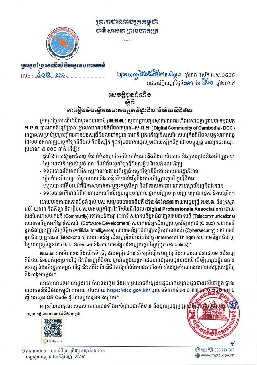 ក្រសួងប្រៃសណីយ៍ និងទូរគមនាគមន៍ ក៏បានអំពាវនាវ និងលើកទឹកចិត្តដល់មន្ត្រីរាជការ សិស្សនិស្សិត បញ្ញវន្ត និងសាធារណជនដែលមានជំនាញឌីជីថល និង/ឬកំពុងប្រកបវិជ្ជាជីវៈជំនាញឌីជីថល ចូលរួមក្នុងសមាគមអ្នកវិជ្ជាជីវៈវិស័យឌីជីថលដើម្បីប្រមូលផ្ដុំធនធានមនុស្ស និងអភិវឌ្ឍសមត្ថភាពវិជ្ជាជីវៈលើវិស័យឌីជីថលឱ្យកាន់តែមានភាពរឹងមាំ សំដៅរួមចំណែកដល់ការអភិវឌ្ឍសេដ្ឋកិច្ចនិងសង្គមកម្ពុជា។