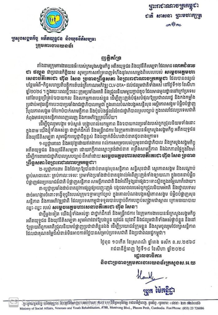 នារសៀលថ្ងែទី១៤ ខែសីហានេះ ថ្នាក់ដឹកនាំ សមាជិក សមាជិកា ក្រុមការងារយេនឌ័រក្រសួងសង្គមកិច្ច អតីតយុទ្ធជន និងយុវនីតិសម្បទា ដែលមានលោកជំទាវ ជា ផល្គុន ជាប្រធានកិត្តិយស សូមប្រកាសជឿជាក់លើរាជរដ្ឋាភិបាលកម្ពុជា និងគាំទ្រយ៉ាងពេញទំហឹងនូវសារសម្លេងពិសេសរបស់សម្តេចអគ្គមហាសេនាបតីតេជោ ហ៊ុន សែន ប្រធានព្រឹទ្ធសភា នៃព្រះរាជាណាចក្រកម្ពុជា ទៅលើកិច្ចសហប្រតិបត្តិការតំបន់ត្រីកោណអភិវឌ្ឍន៍ CLV(DTA) កម្ពុជា-ឡាវ-វៀតណាម។