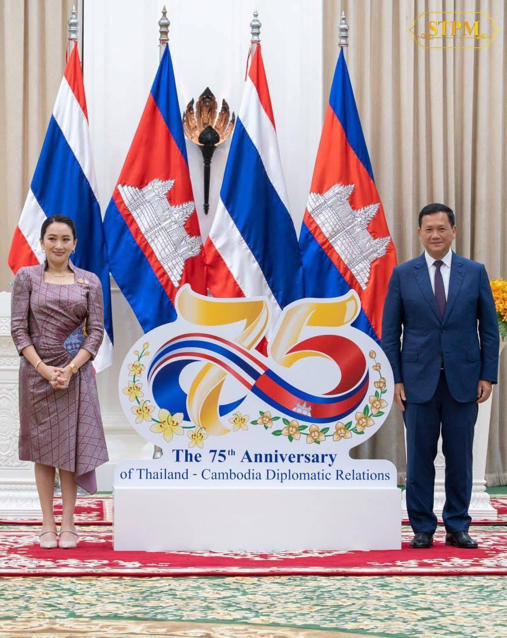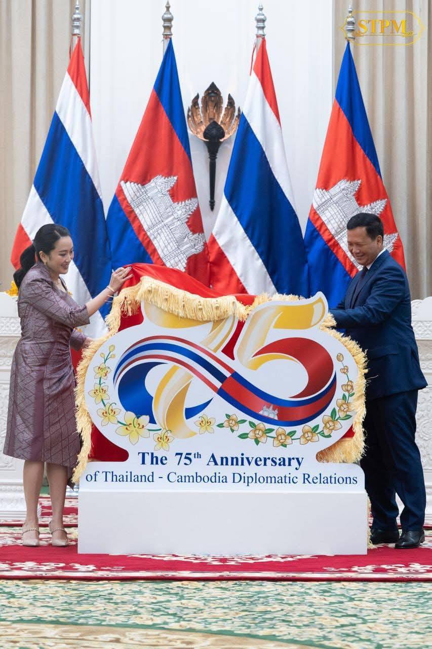 ជាមួយគ្នានោះដែរ សម្តេចមហាបវរធិបតី ហ៊ុន ម៉ាណែត នាយករដ្ឋមន្ត្រីនៃព្រះរាជាណាចក្រកម្ពុជា និងលោកជំទាវ ផែថងថាន ស៊ីណាវ៉ាត់ (Paetongtarn Shinawatra) នាយករដ្ឋមន្ត្រី នៃព្រះរាជាណាចក្រថៃ បានអញ្ជើញសម្ពោធនិមិត្តសញ្ញាខួបអនុស្សាវរីយ៍ លើកទី៧៥ នៃការបង្កើតទំនាក់ទំនងការទូតកម្ពុជា-ថៃ នៅវិមានសន្តិភាព នៅថ្ងៃពុធ ទី២៣ ខែមេសា ឆ្នាំ២០២៥៕