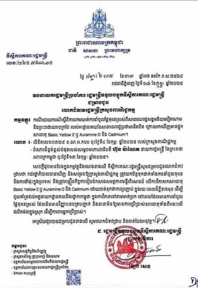 ថ្ជថ្ងៃទី១១ ខែឧសភា ឆ្រនាំ២០២៥ ដ្ឋាភិបាលកម្ពុជា បានគិតគូរខ្លាំងណាស់ចំពោះសុខមាលភាពប្រជាពលរដ្ឋ តាមរយៈទីស្តីការគណៈរដ្ឋមន្ត្រី បានចេញលិខិតជម្រាបជូនរដ្ឋមន្ត្រីក្រសួងពាណិជ្ជកម្ម ដើម្បីហាមឃាត់ការនាំចូលផ្លែទុរេនពីវៀតណាម និងថៃ បន្ទាប់ពីគយចិន រកឃើញសារធាតុគីមី ដែលនាំអោយប៉ះពាល់សុខភាព ។