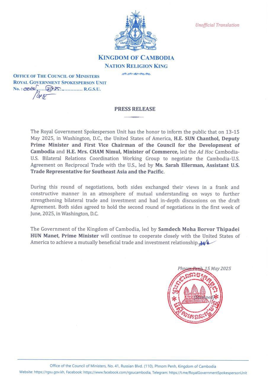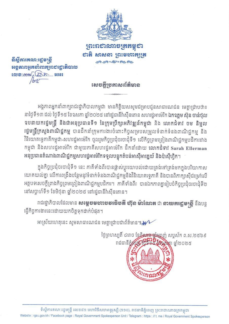 លទ្ធផលនៃកិច្ចប្រជុំចរចាជុំទី១ លើកិច្ចព្រមព្រៀងពាណិជ្ជកម្មបដិការរវាងកម្ពុជា និងសហរដ្ឋអាម៉េរិក ពីថ្ងៃទី១៣ ដល់ថ្ងៃទី១៥ ខែឧសភា ឆ្នាំ២០២៥