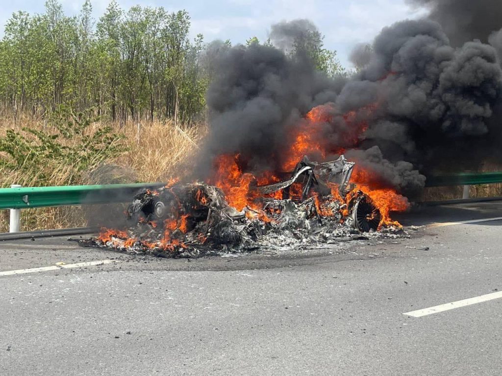 រថយន្ត Range Rover ពណ៏ស មួយគ្រឿង កំពុងឆាបឆេះនៅលើផ្លូវល្បឿនលឿន